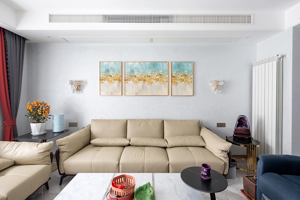 從客廳處映入眼簾的便是郁郁蔥蔥的綠植,體現(xiàn)出屋主對(duì)于生活認(rèn)真的態(tài)度。客廳的墻面板采用白色大理石紋路,墻面的裝飾畫(huà)給整個(gè)空間增添了美感。