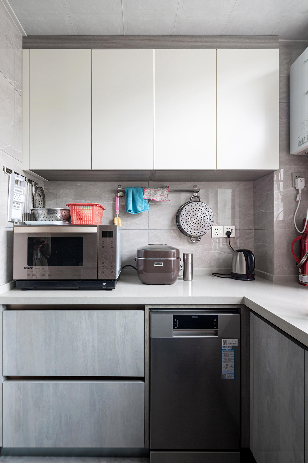 廚房在風(fēng)格上延續(xù)了現(xiàn)代簡(jiǎn)約的風(fēng)格,采用U 形的廚房布局設(shè)計(jì),在臺(tái)面下方做了一個(gè)與陽(yáng)臺(tái)洗衣機(jī)柜相同的柜體。左側(cè)做了廚具收納,右側(cè)放置家電,在布局上不僅美觀,而且同時(shí)具備了收納的功能。