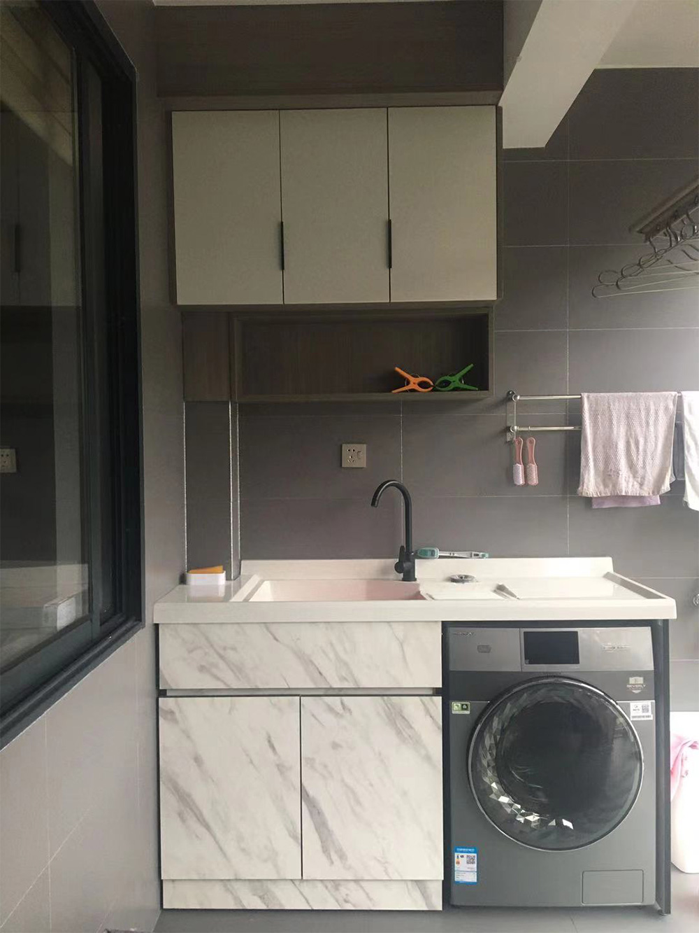 連體的洗衣機(jī)柜臺(tái),下方采用白色大理石紋路的柜門(mén)。上面做了掛柜的設(shè)計(jì),既節(jié)省空間,又方便了物品的放置。