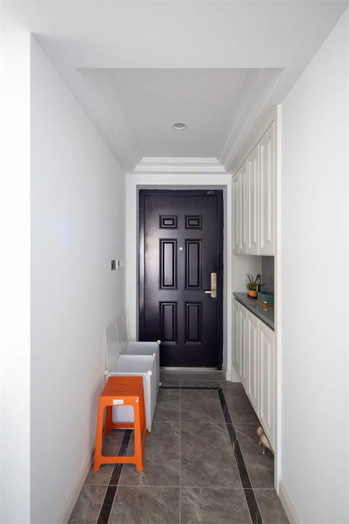 打開家門玄關是第一眼便能看到的,嵌入式玄關平行于墻面,十分平整不占據(jù)額外的空間。玄關整體是芬蘭白的墻面,玄關柜們使用膜壓門板,打磨的深度和形狀流暢。戶主在上方放了一些雜物,中間做了鏤空臺面,平時放鑰匙扣、快遞、雨傘都很方便。下雨平常出門著急,將鞋子放進下方空間中,省心又不會讓家里看起來太亂。
