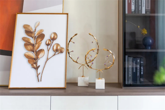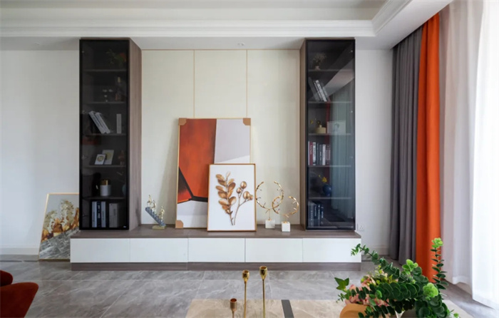 因為電視機未到所有在電視柜上方擺上掛畫以裝飾。電視柜上方兩側(cè)對稱分布著書柜,日常放放書和獎杯獎狀??紤]到電視柜長度和寬度的問題,如果只放電視機會有些空蕩,書柜的打造提供收納功能,也讓整體更加飽滿。