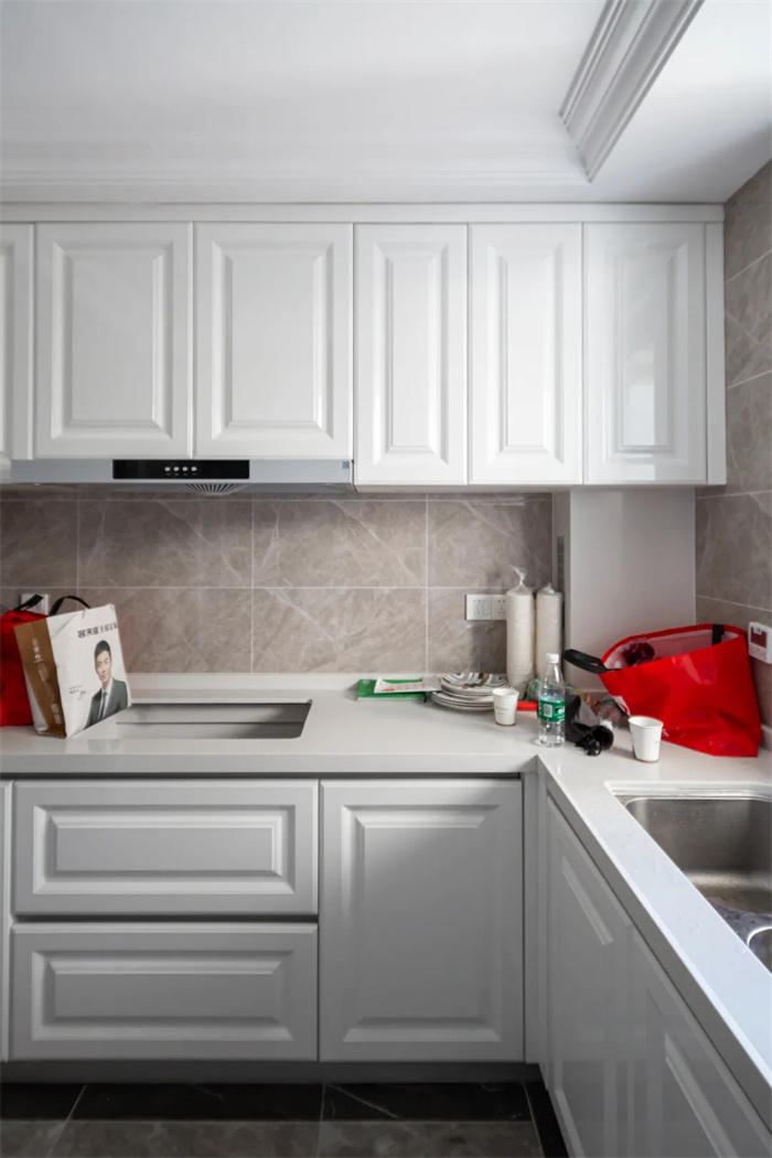 芬蘭白膜壓門板搭配大理石紋路的瓷磚,空間干凈又簡潔。廚房空間為典型的L字型設計,從做飯到洗碗家居動線流暢清晰。