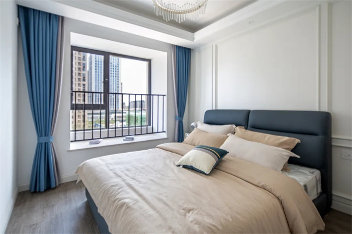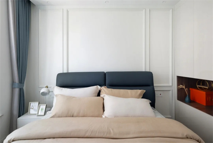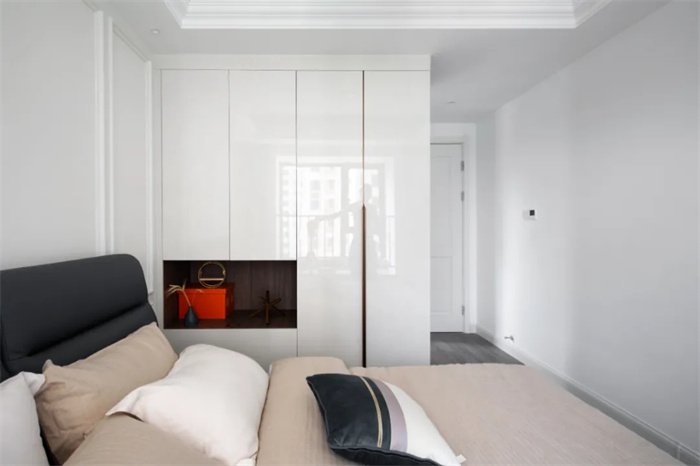 臥室采用膜壓板背景墻,石膏線給背景墻增加層次感。飄窗處安置了護欄,為孩子的安全保駕護航。整面的衣柜處在左側(cè)做了鏤空,給白色增加點質(zhì)感,顯得小巧又實用。