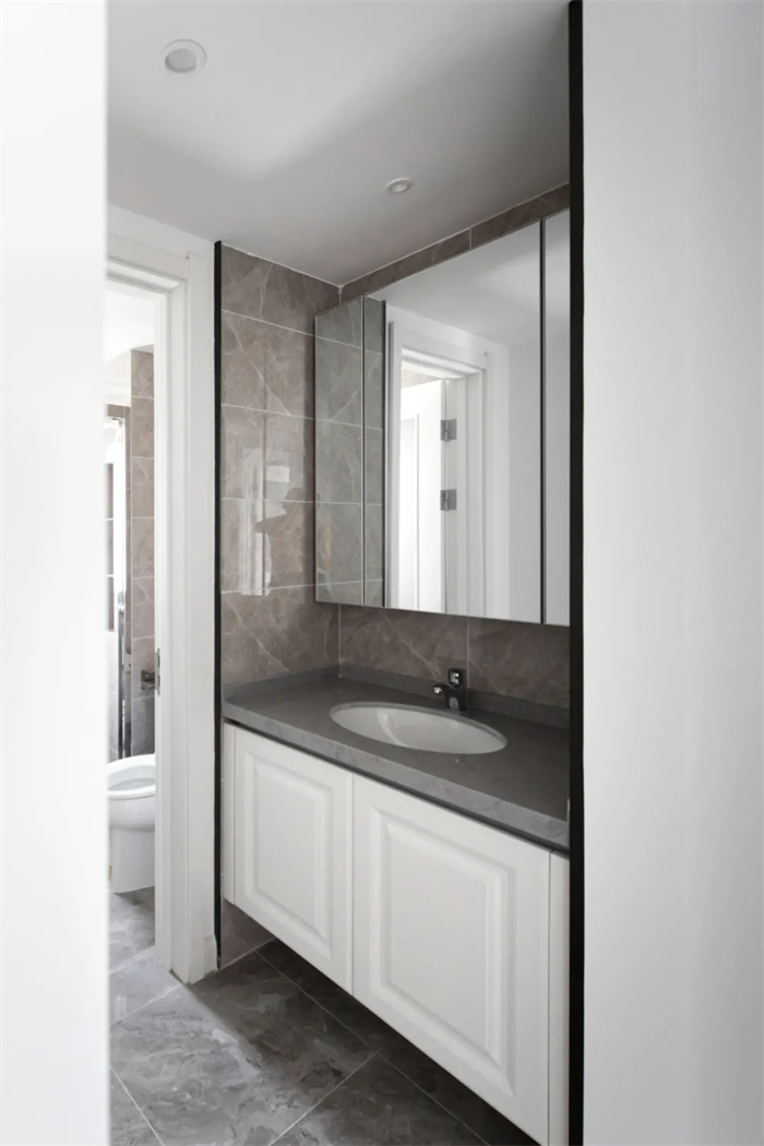 衛(wèi)浴處下方先是芬蘭白膜壓門板,里處打造半包圍形的淋浴間,下方踢腳線抬高避免水流的流出,整體衛(wèi)浴間做到了干濕分離。