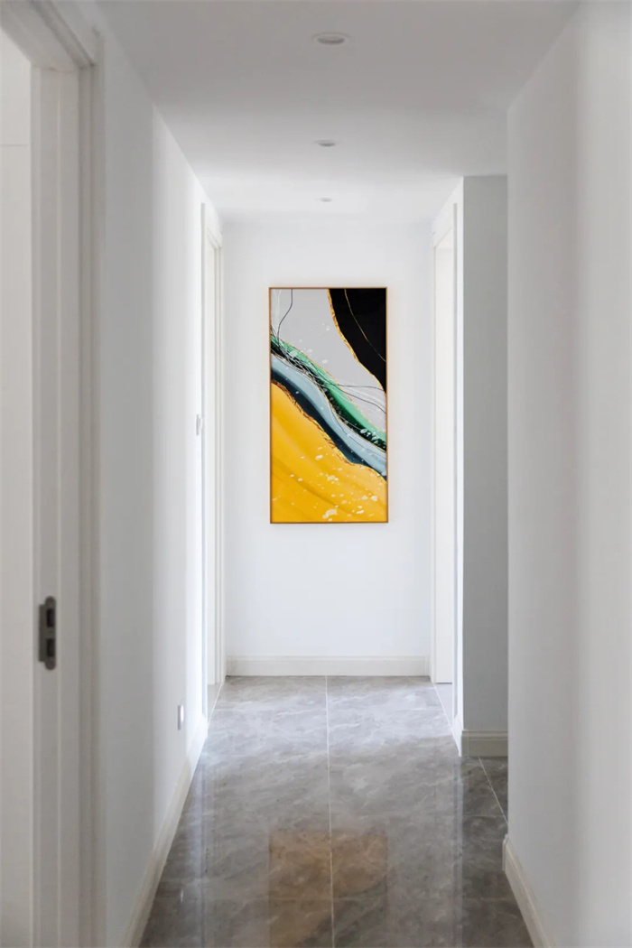 走廊起到連接和貫通的作用,兩側(cè)分布著臥室和兒童房,墻上如沙灘海浪的掛畫,給人清新的感受。