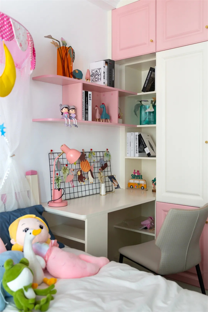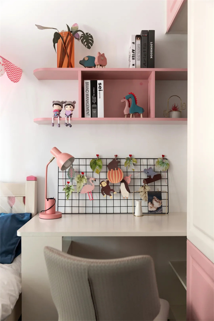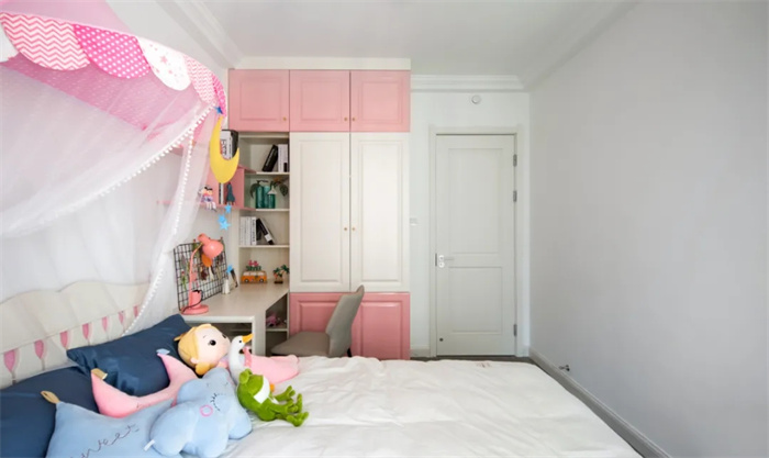 由于戶主家有個小女孩,所以在顏色搭配上選擇了粉粉嫩嫩的粉色,與白色中和,整體十分柔和,仿佛掉進糖果蜜罐里。床上放置了一些娃娃,也是非常用心了。