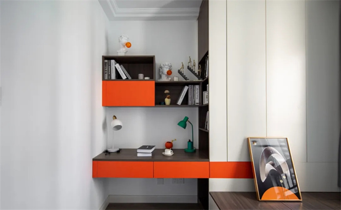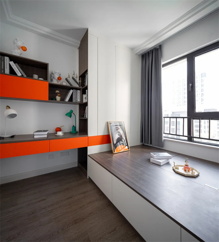 此間臥室的床鋪采用榻榻米的設計,床上方可以自如掀開儲放雜物。整體空間選用最亮眼的橘色搭配不沖突的橡木紋,在視覺上給人以沖擊感。書桌上方安置吊柜,留出一段距離不至于顯得擁擠。