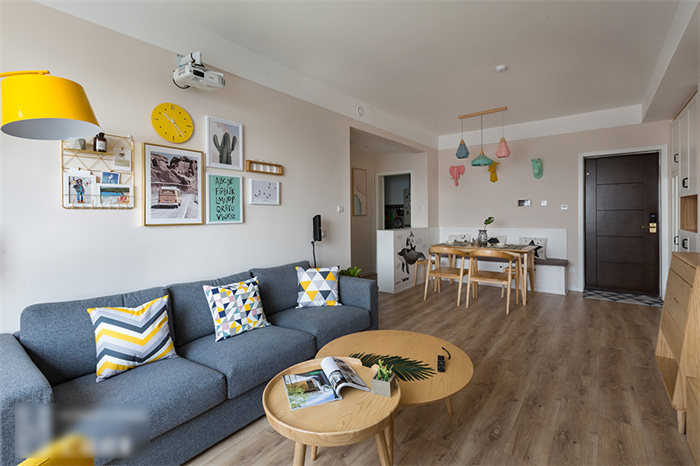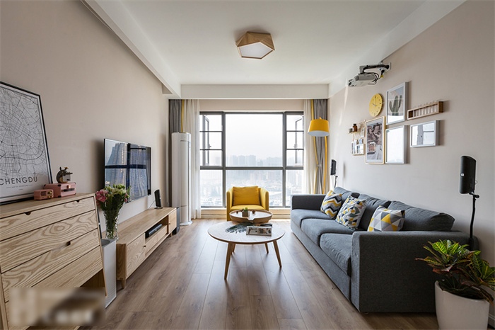 為了迎合屋主對(duì)于自然氣息的熱愛(ài),在地面和家具的處理上不難看出使用了大面積的原木色。兩個(gè)大小不一、高度不同的茶幾拼湊出時(shí)尚,亮黃色的燈具在駝色墻面的襯托下顯色尤為出彩。或許,這才是家的正確打開(kāi)方式......