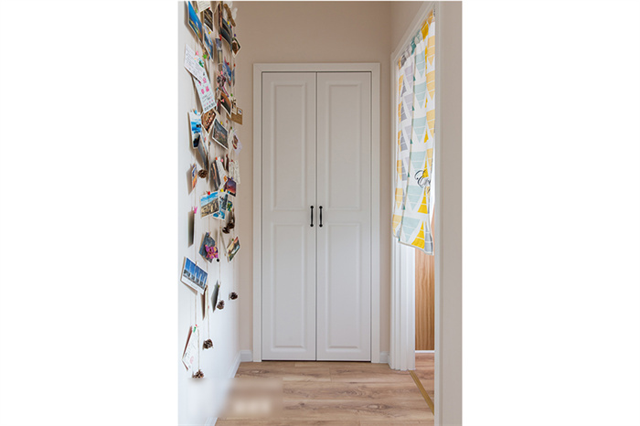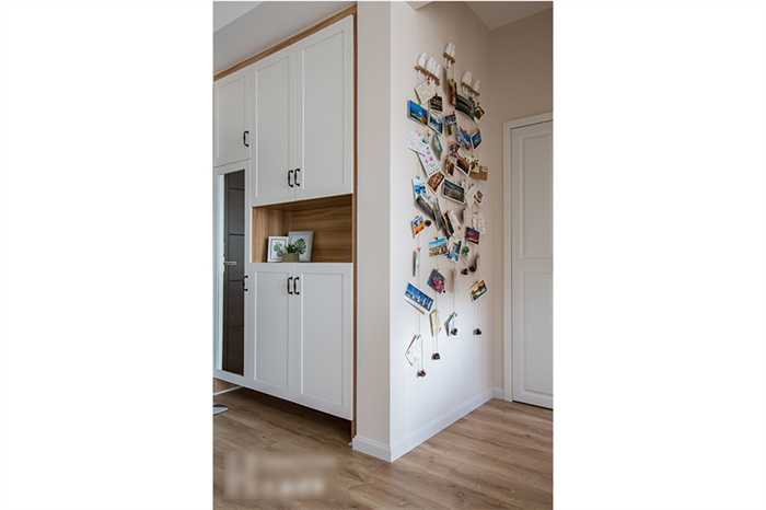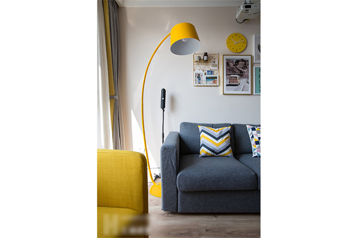 進(jìn)入客廳,首先映入眼簾是簡(jiǎn)約的白色立柜和一組照片墻的設(shè)計(jì)。每一張照片仿佛都在述說(shuō)一個(gè)故事,記錄這個(gè)95后小夫妻每個(gè)難忘的瞬間。客來(lái)福定制的芬蘭白入戶(hù)柜和木門(mén)在照片墻的陪襯下溫馨感十足。撞色的沙發(fā),簡(jiǎn)潔明快的亮黃色搭配深灰色立體感拉滿(mǎn),駝色墻面上的藝術(shù)畫(huà)交錯(cuò)搭配,透露著一絲文藝氣息。