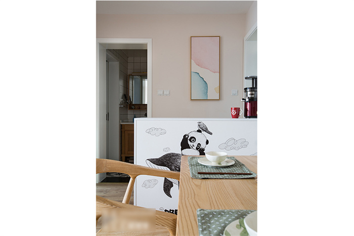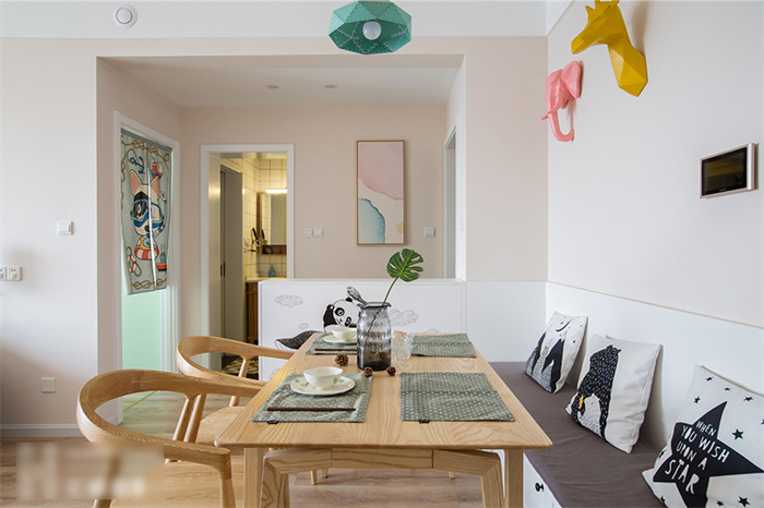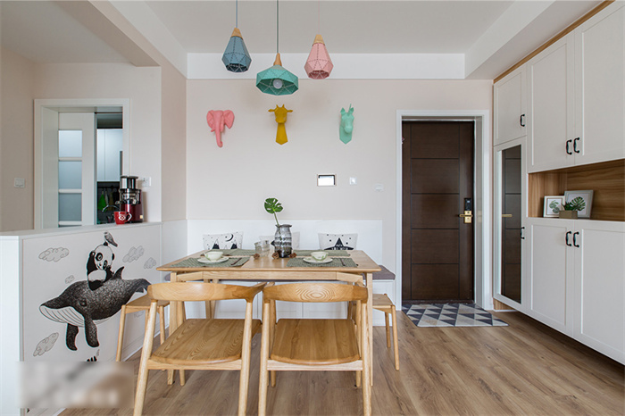 餐廳除了滿(mǎn)足正常用餐的需求之外,還增加了收納功能。為此客來(lái)福在餐廳處專(zhuān)門(mén)定制了一排繞墻的沙發(fā)柜,這樣家里就算多幾個(gè)人來(lái)就餐,也不會(huì)顯得擁擠。原木色的餐桌與馬卡龍色系的吊燈平衡出北歐精致。餐廳墻面上,三種動(dòng)物的掛件與同色系吊燈在鮮明的顏色中演繹著北歐風(fēng)情。