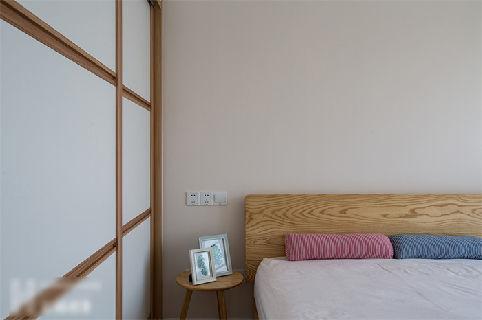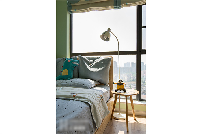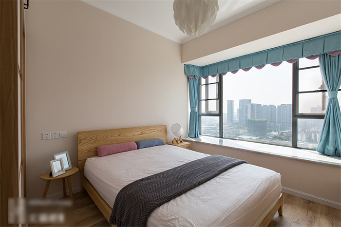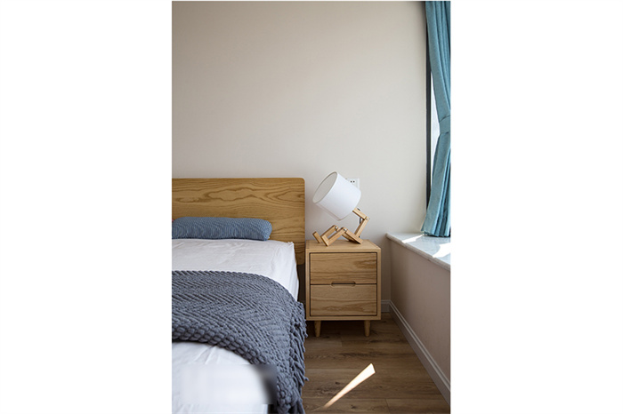主臥的設(shè)計(jì)從實(shí)用性出發(fā),白色的衣柜和墻面形成一體,顯得生氣十足;在床頭柜的選擇上也是遵從屋主追求自然的理念,原木床體,搭配設(shè)計(jì)感十足的幾何造型床頭燈,渲染出濃濃的自然氣息。湖藍(lán)色的飄窗無(wú)不在表達(dá)簡(jiǎn)約、舒適的生活主題。“當(dāng)清晨的第一縷陽(yáng)光透過(guò)窗簾的縫隙擠進(jìn)來(lái),余生,我想把日子過(guò)成自己想要的模樣。”