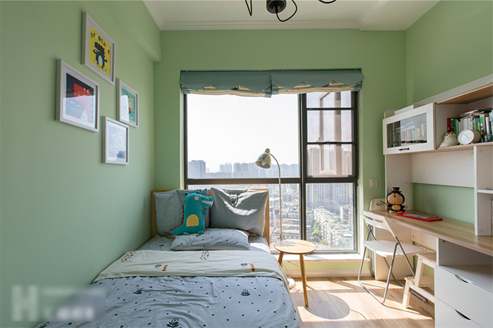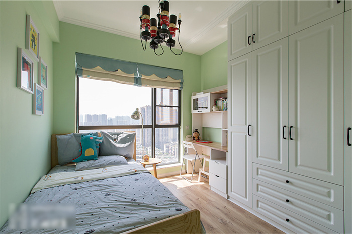 兒童房以綠色為背景,搭配白色吊燈和立柜,活潑中還有一絲可愛(ài)。墻上的兒童簡(jiǎn)筆畫(huà)、兒童家具、卡通玩偶,營(yíng)造了一個(gè)夢(mèng)幻、童真、舒適、富有想象力的空間。