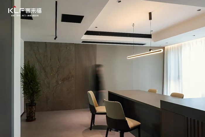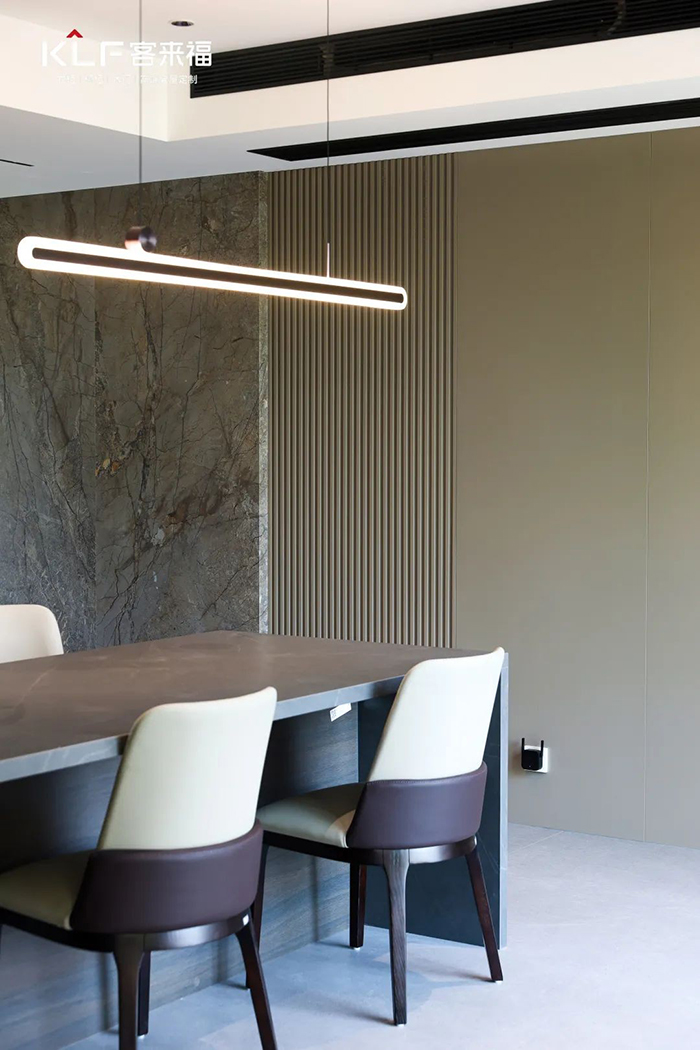 二層作為餐廚空間,圍繞簡約設(shè)計理念在家居配色上以黑灰等深色系家居設(shè)計渲染整體氛圍,在墻面設(shè)計上,設(shè)計師將大理石與木質(zhì)墻板進(jìn)行結(jié)合,多重材質(zhì)組合,豐富空間元素。