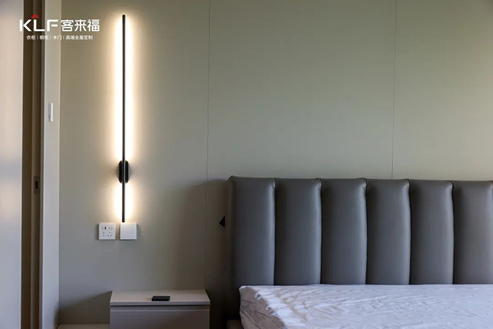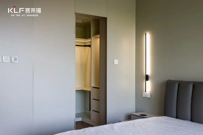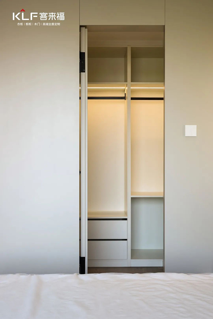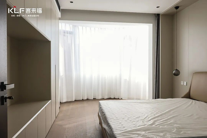 臥室衣柜多采用芬蘭白柜體,簡潔大方,輕松打造出極簡奶油風(fēng),搭配定制木作背景墻,手感細(xì)膩,高級品味不言而喻。
