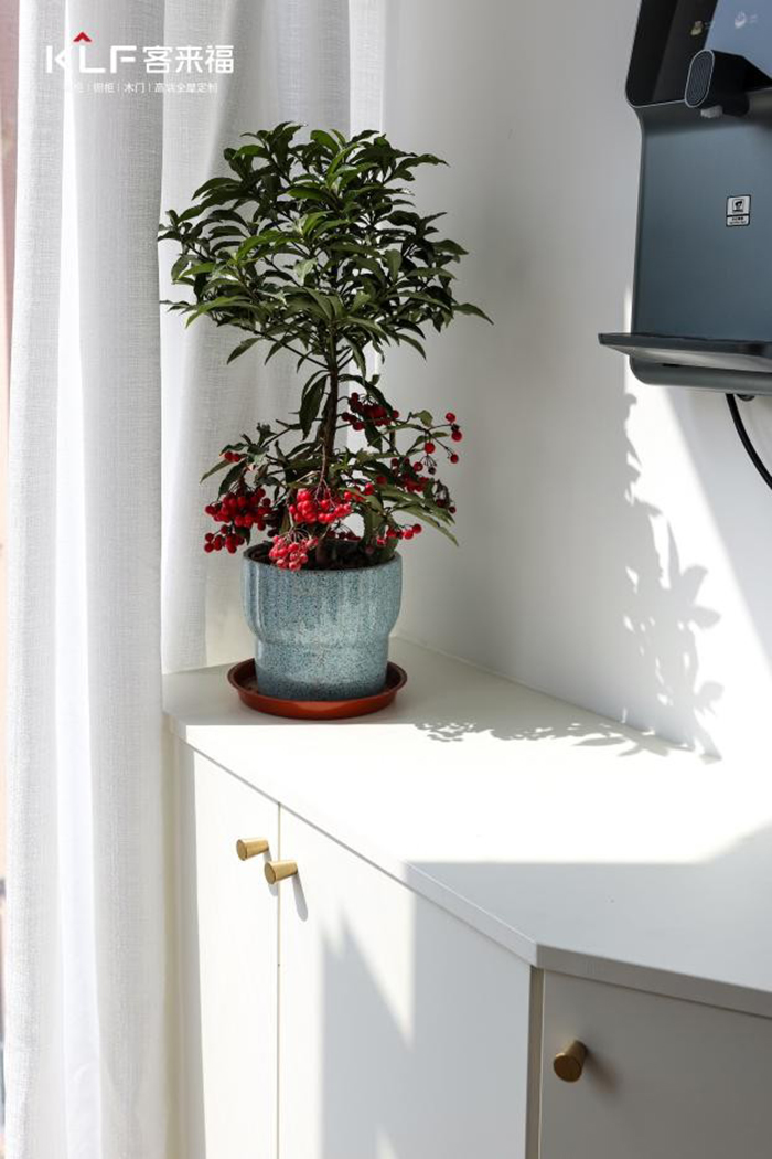 陽臺柜設(shè)計依據(jù)墻壁走勢打造斜邊造型,芬蘭白柜體搭配古銅金小拉手,充滿簡約法式氣息,擱置一兩盆小花,用春的鮮艷裝點生活。