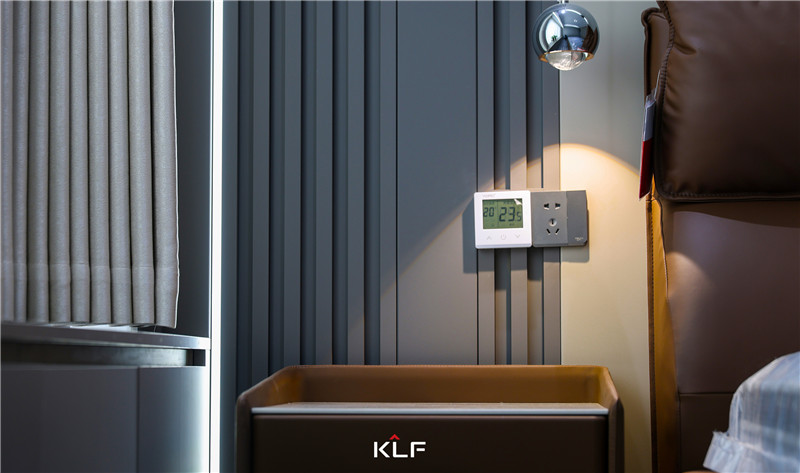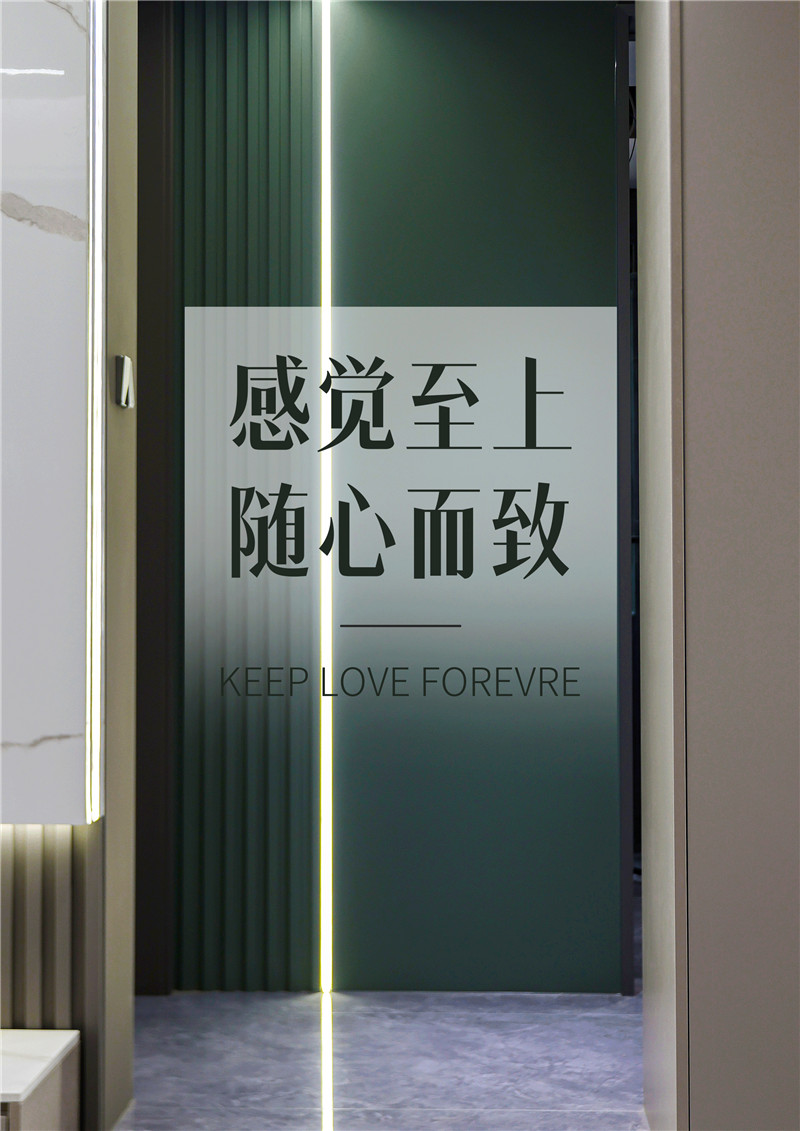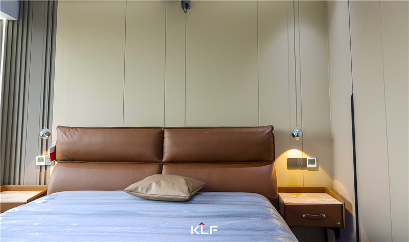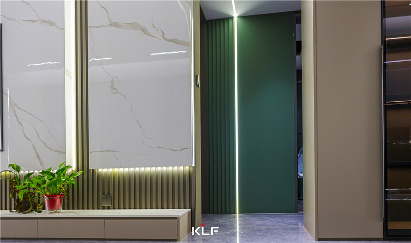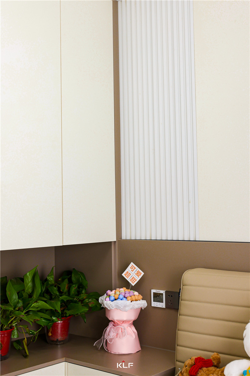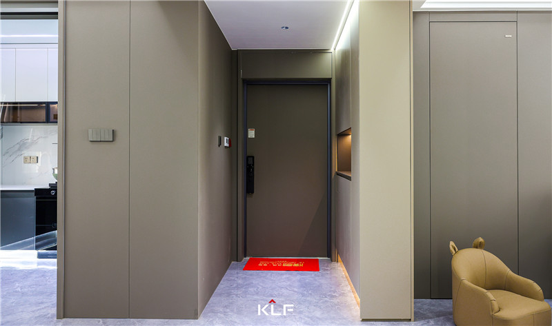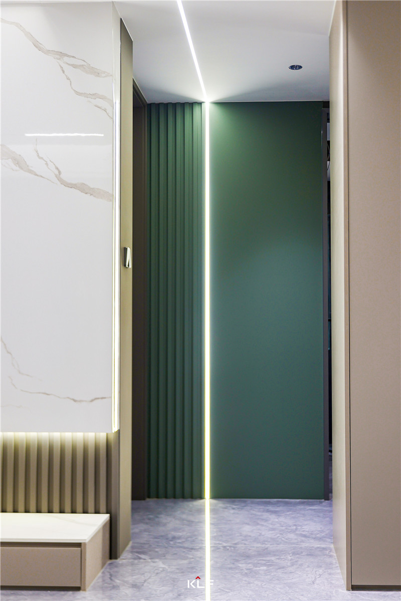 例如在過道處的格柵護(hù)墻板采用了客來福·碧玉的顏色,清新自然,凸顯質(zhì)感。而在臥室中則采用了更為深沉的灰色系不規(guī)則格柵墻板,營造平靜高級的家居氛圍。