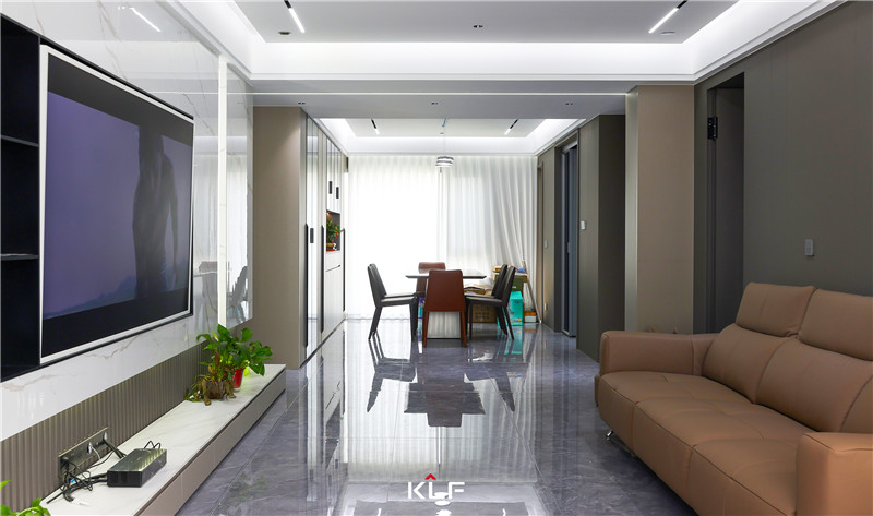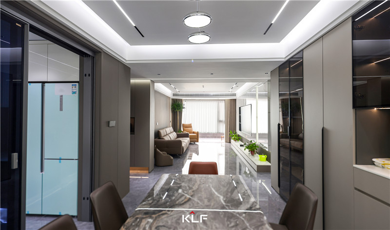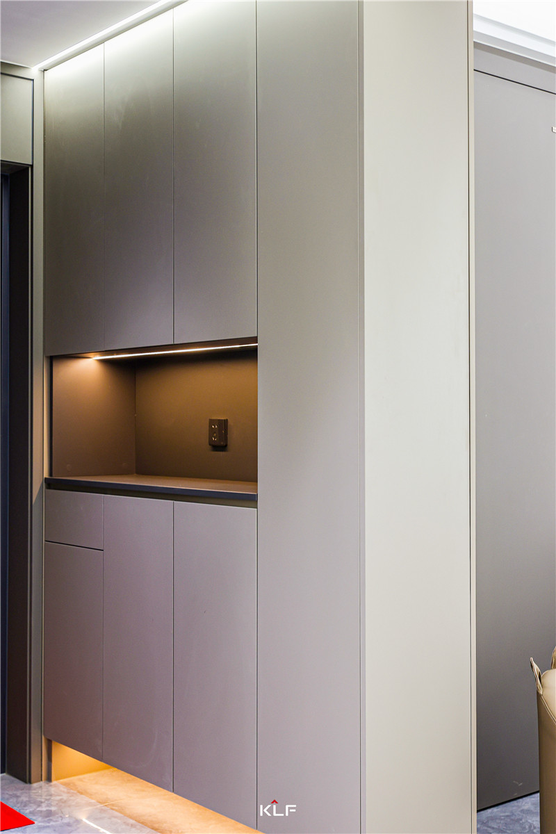 在柜體設(shè)計(jì)上想要傳遞出輕奢理念,除了暗藏?zé)魩У某R?guī)操作,可以在色彩搭配上與材質(zhì)上入手。例如案例中多處采用半透茶色彩玻作為柜門點(diǎn)綴使用,既增添了空間的通透感呼吸感,也讓整體帶有“都市輕奢”的意蘊(yùn)。