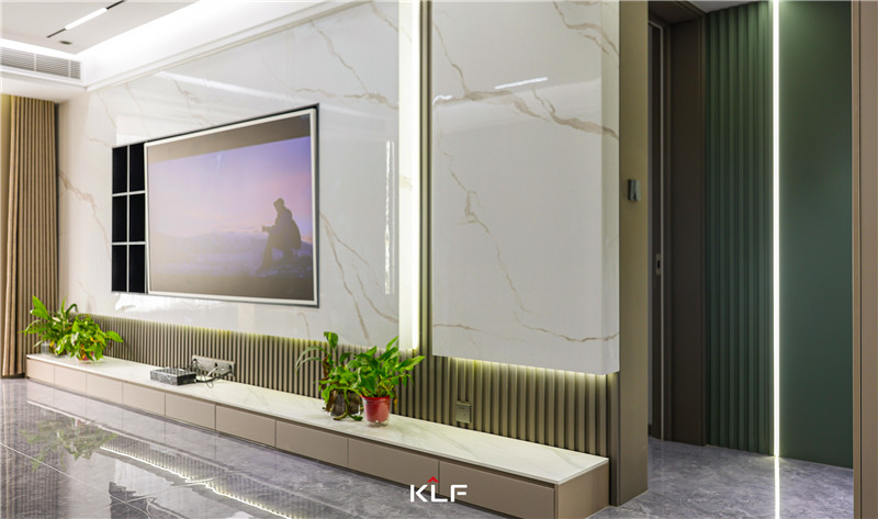 沙發(fā)背景墻也采用了布魯灰平板造型護(hù)墻板與芬蘭白豎向格柵拼接的設(shè)計(jì),灰白撞色簡約淡雅,強(qiáng)化了整體空間的細(xì)節(jié)與質(zhì)感。垂直的線條更加能刻畫出木作柔和的美感,強(qiáng)調(diào)整齊等距的韻律感,并巧妙地結(jié)合光影、綠植,勾勒藝術(shù)空間。