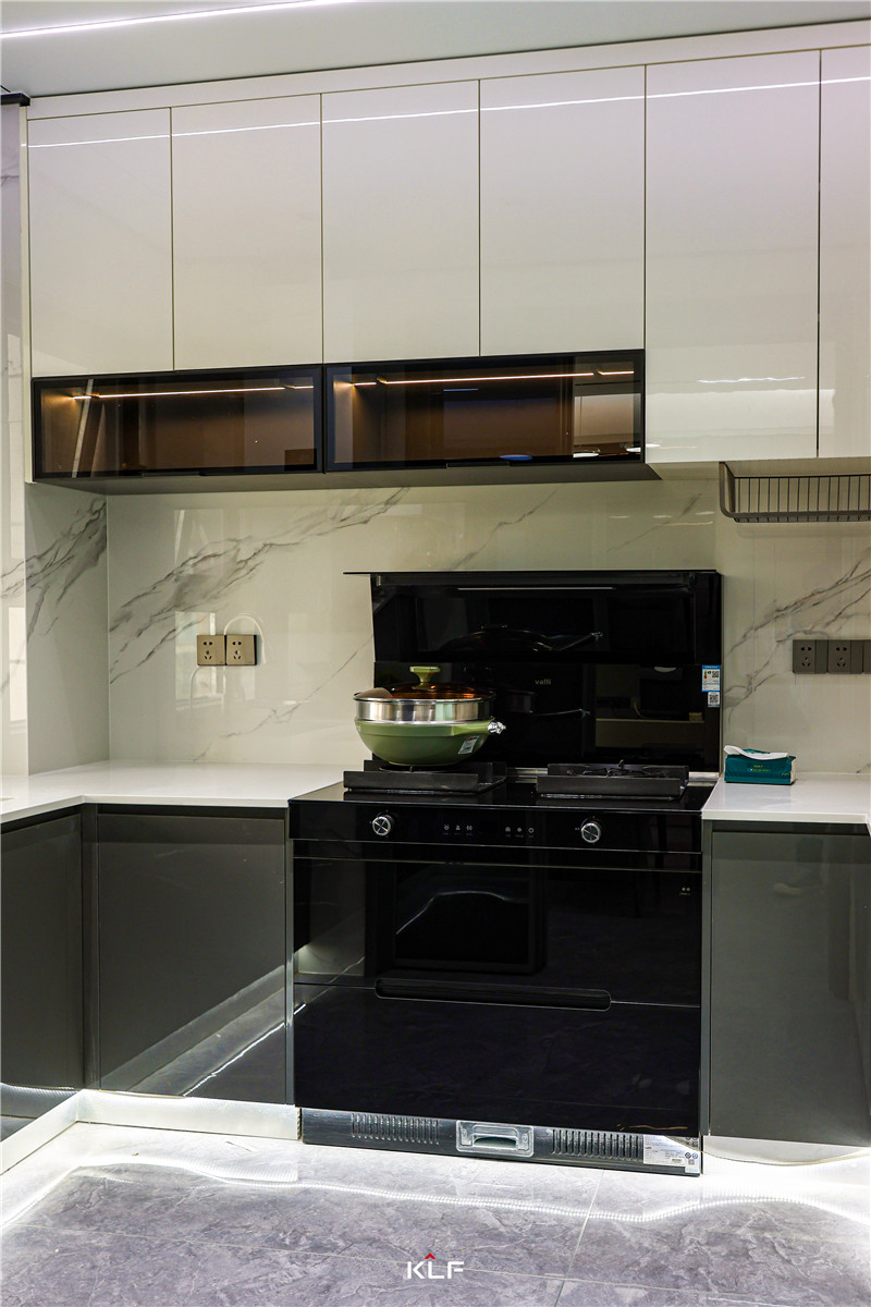 廚房采用U型布局,灰白兩色搭配簡單干凈。餐邊柜的設(shè)計(jì)遵循“二八原則”,小面積展示+大空間儲物,可以讓家居用品都有序擱置,不凌亂的家,才更美好。柜體采用PET門板,光澤度好,搭配半透茶色玻璃柜門,通透又優(yōu)雅。