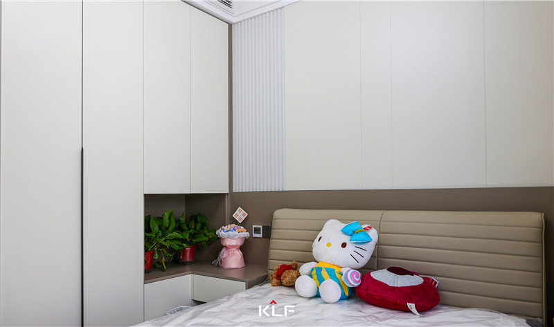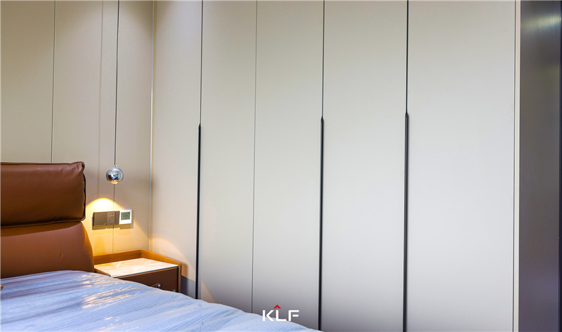 將格柵作為空間肌理進(jìn)行使用,與拉槽墻板一同設(shè)計(jì),實(shí)現(xiàn)門墻柜同色,豐富平面讓整體空間從視覺上更統(tǒng)一美觀。臥室衣柜依據(jù)墻壁走勢定制,根據(jù)不同衣物收納需求設(shè)計(jì)分區(qū),讓衣柜更懂人居。