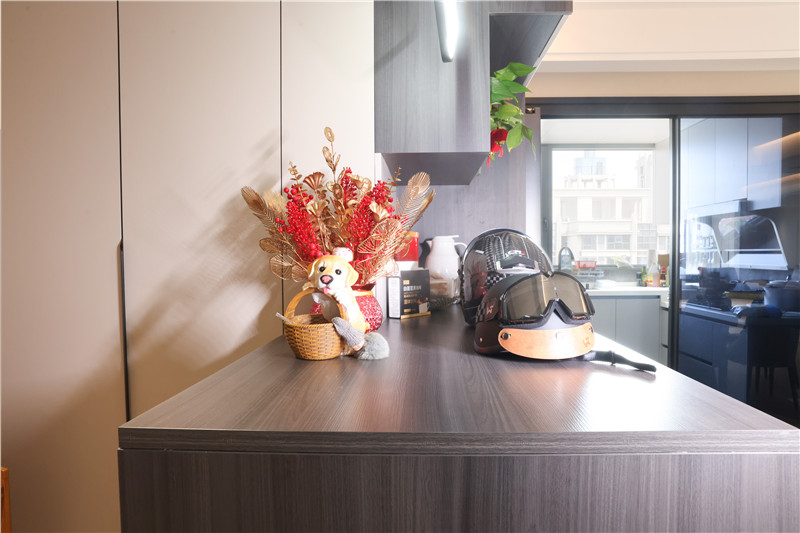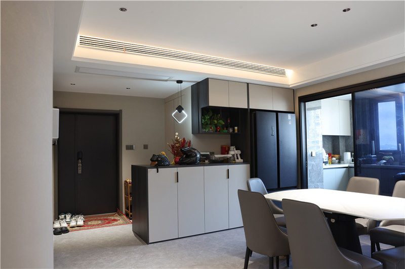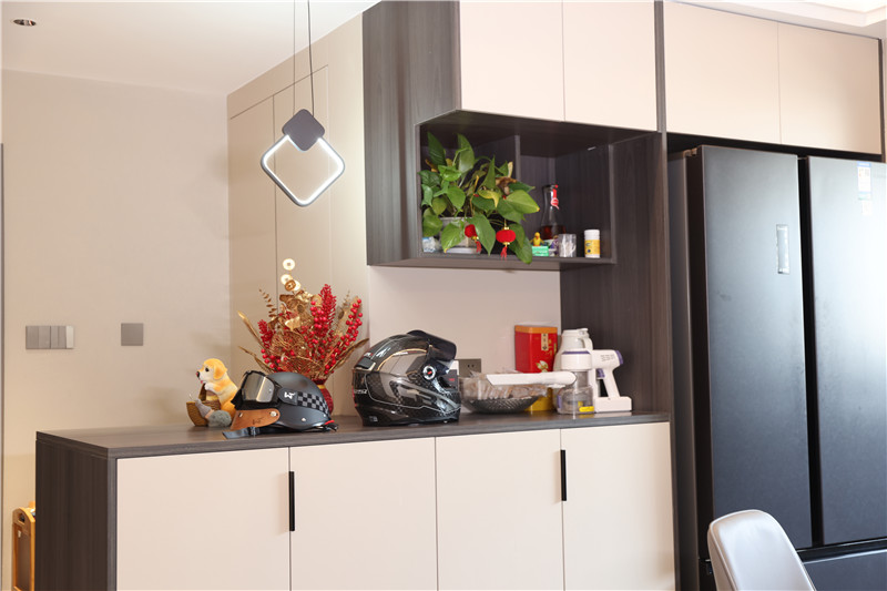 入戶柜L型設(shè)計(jì),選用客來??萍寄炯y+茶白,百搭自然;柜體設(shè)計(jì)充分利用入戶空間,一邊打一柜到頂式整面墻衣柜,增加收納能力,另一邊中部留空放置裝飾品或日常常用物品,既有顏值又實(shí)用;保證收納同時(shí)還內(nèi)嵌冰箱,為廚房減輕儲(chǔ)物壓力。