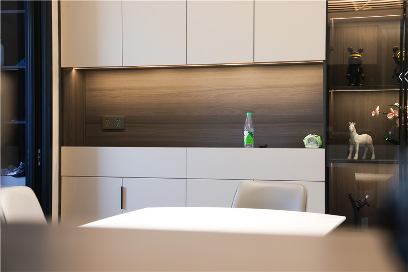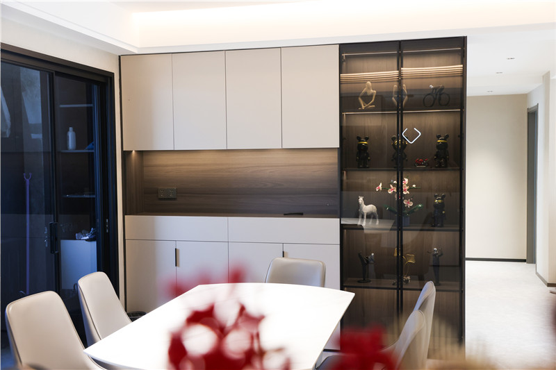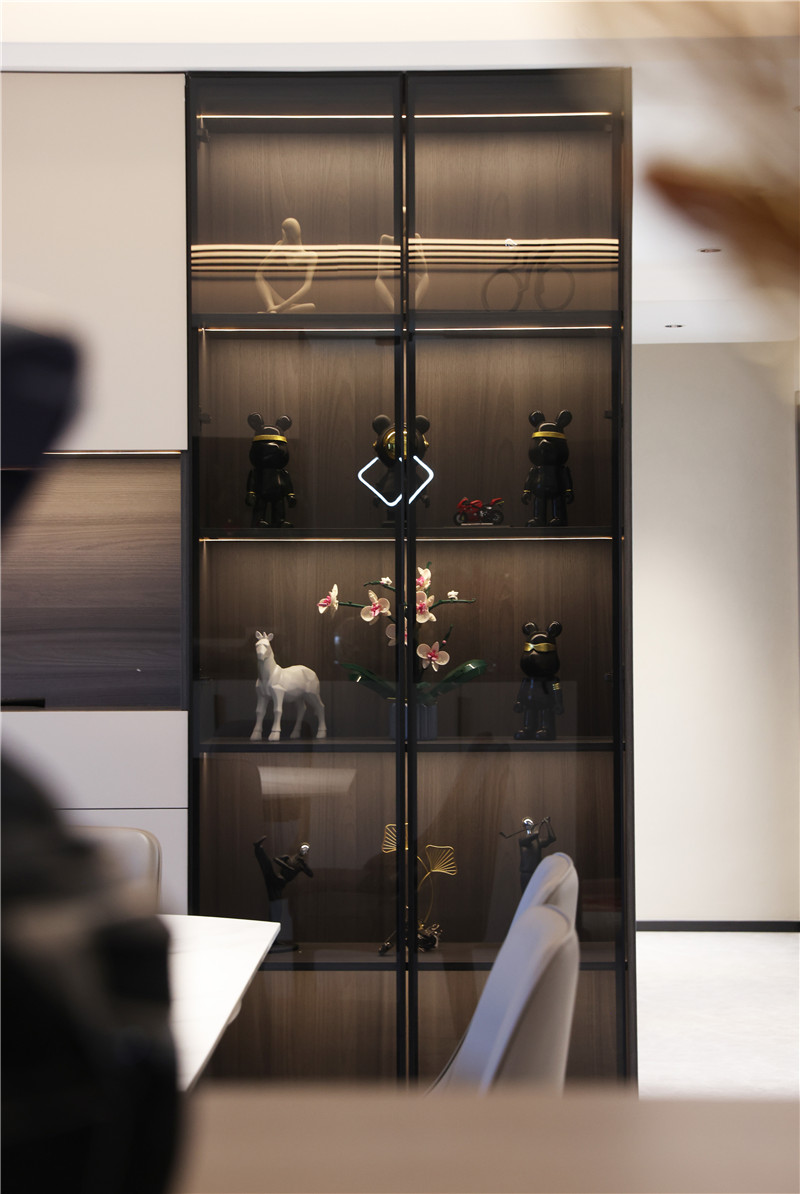現(xiàn)代輕奢少不了細(xì)節(jié)的精致,玻璃柜內(nèi)部木質(zhì)紋理與內(nèi)置燈帶,形成自然與現(xiàn)代的碰撞;黑玻比透明玻璃更加高級(jí)時(shí)尚,也是裝修時(shí)可以留意的設(shè)計(jì)點(diǎn)~
