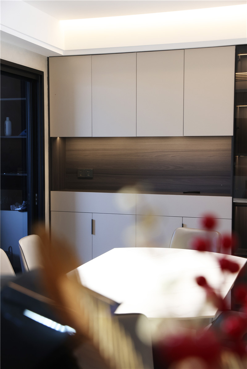 餐邊柜與入戶柜統(tǒng)一材質(zhì),中部保留空間放置物品,再加上兩豎排玻璃柜,為餐邊柜帶來輕奢氛圍,既增加整體顏值又可以充當(dāng)酒柜或裝飾柜。經(jīng)典的餐邊柜設(shè)計(jì)適用大小戶型,值得還在觀望的伙伴們借鑒。