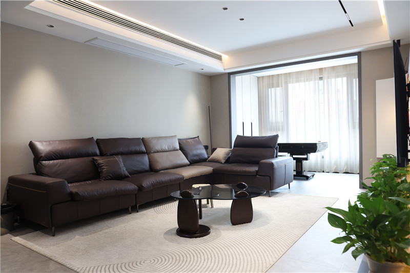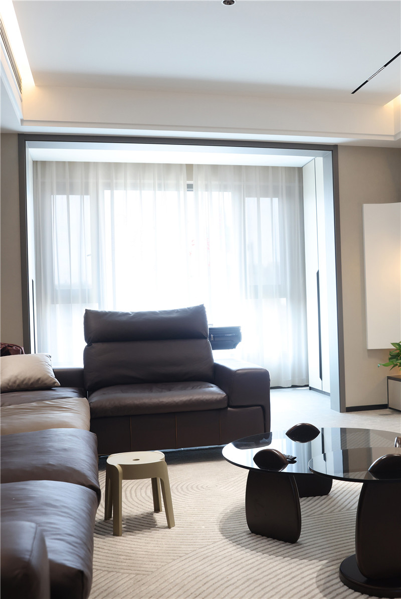 來到客廳,迎面而來是中性色調(diào)散發(fā)出的高級(jí)氛圍,黑色亮面沙發(fā)、白色曲線地毯、黑色小茶幾……整體表達(dá)出屋主時(shí)尚、個(gè)性的家居品味。