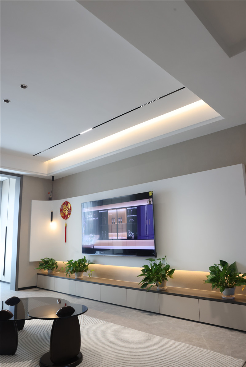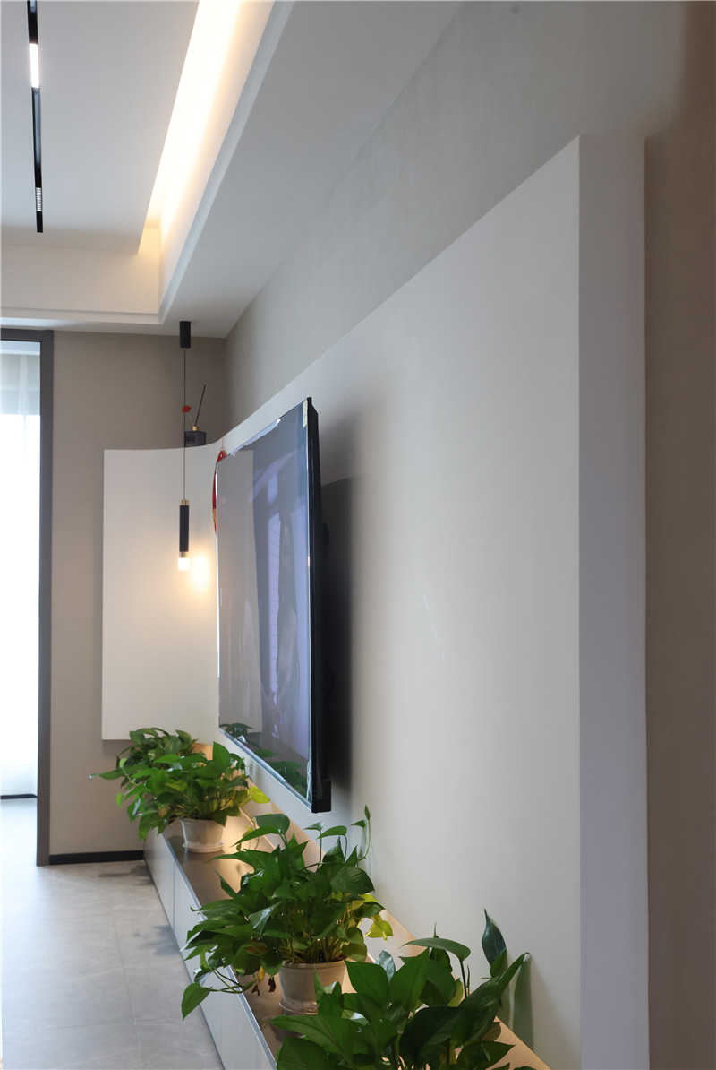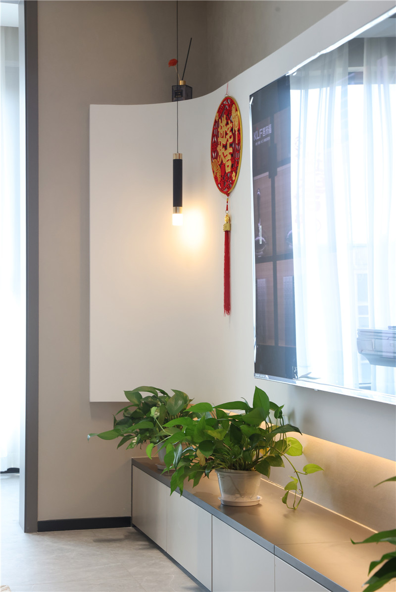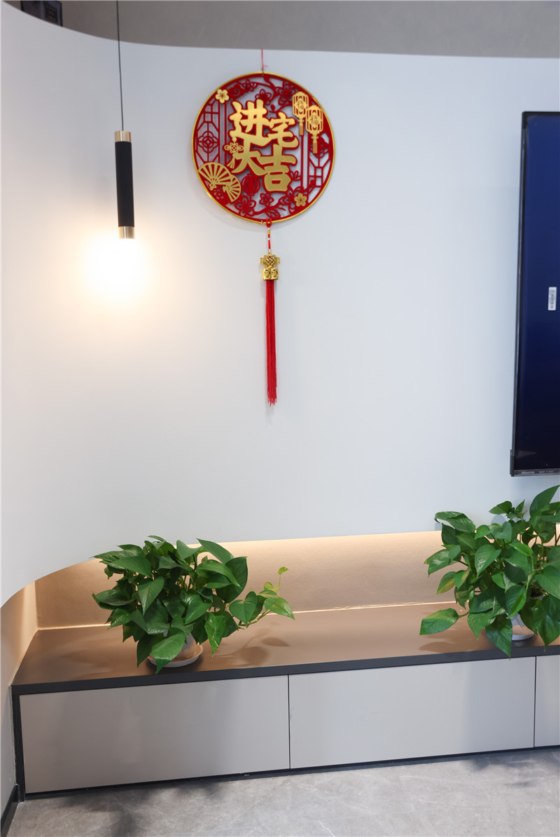 客廳作為門面擔(dān)當(dāng),電視背景墻也處于舉足輕重的地位。打破常規(guī),不參照常用的設(shè)計(jì)手法,將電視背景作弧形電視墻,通過流暢的藝術(shù)線條,達(dá)到視覺的延伸,整體更具輕盈感。