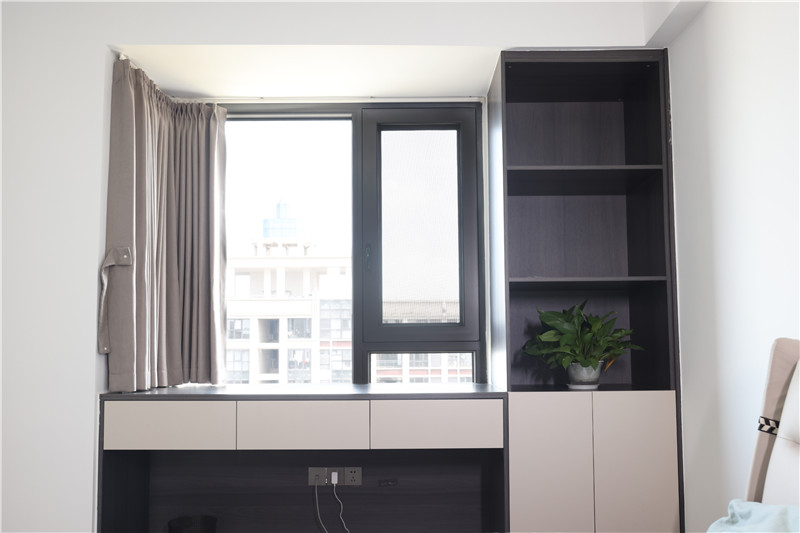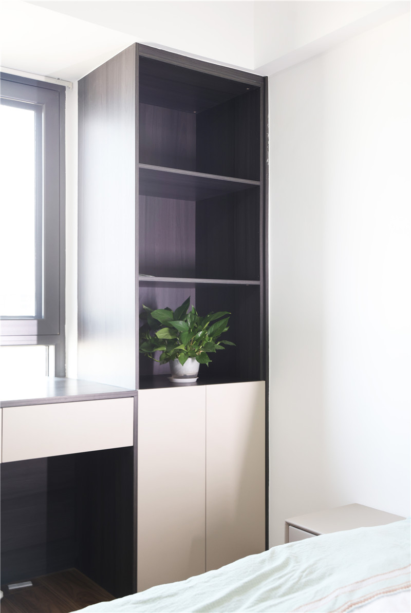 靠窗作書桌與收納柜,與衣柜選用同種材質(zhì),整體和諧統(tǒng)一。開放格設(shè)計(jì)不僅可以充當(dāng)裝飾柜與收納柜,還可以讓空間在視覺上更開闊。