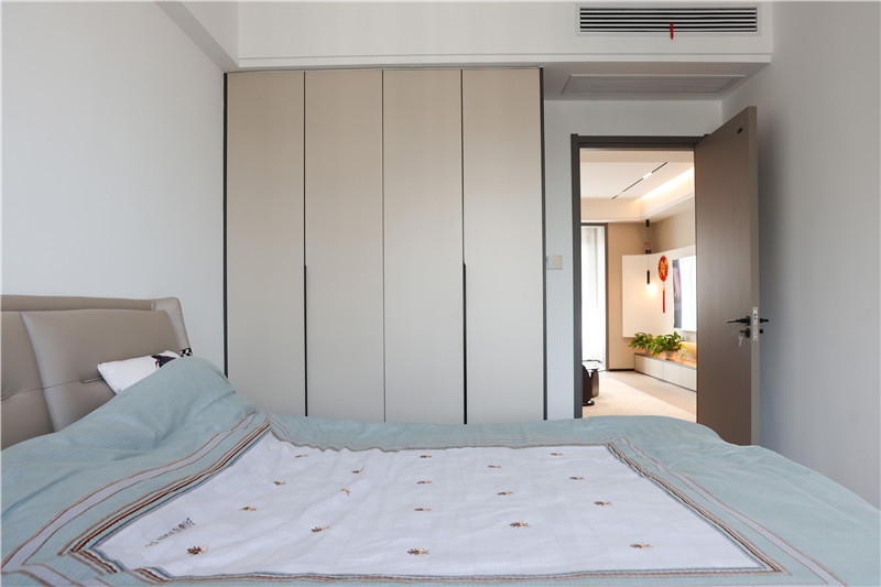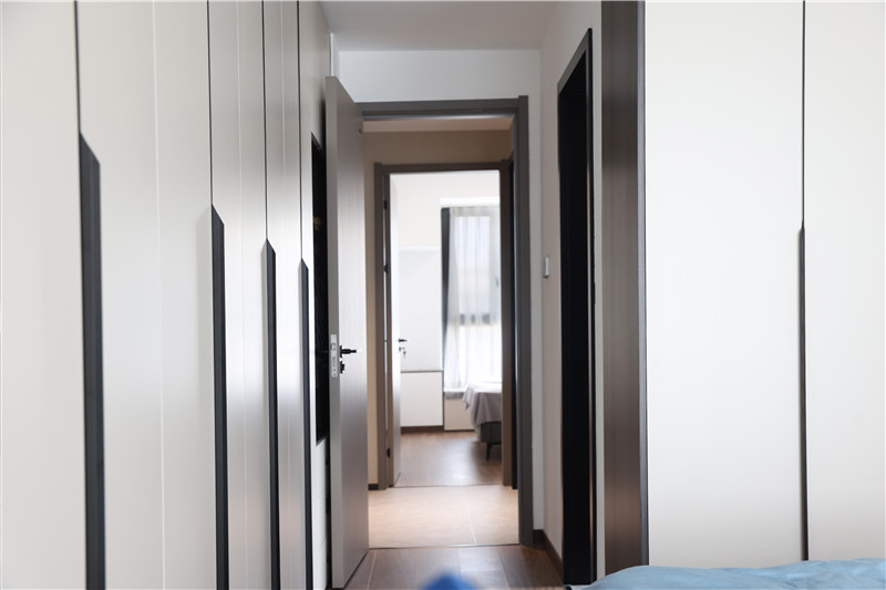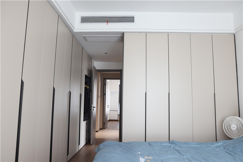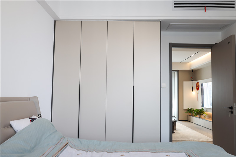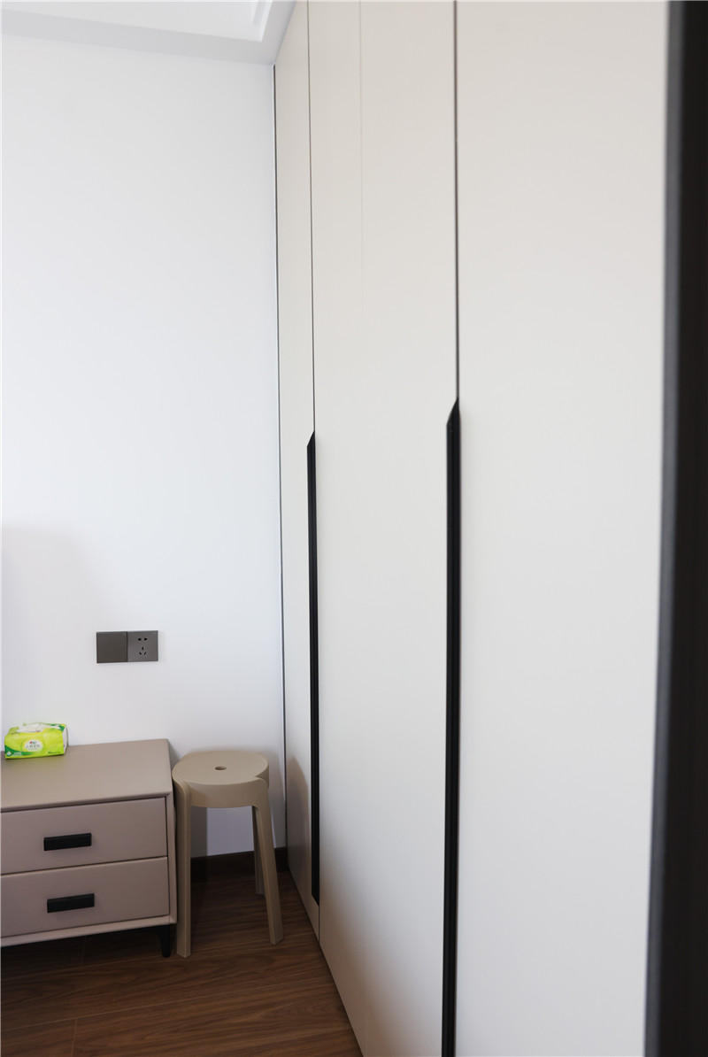 主臥與次臥根據(jù)不同人需求與生活習(xí)慣,都選用了客來??萍寄炯y+茶白,打造不同造型的柜體。衣柜擁有強(qiáng)大收納能力同時(shí),不影響空間顏值與人的活動(dòng)范圍。