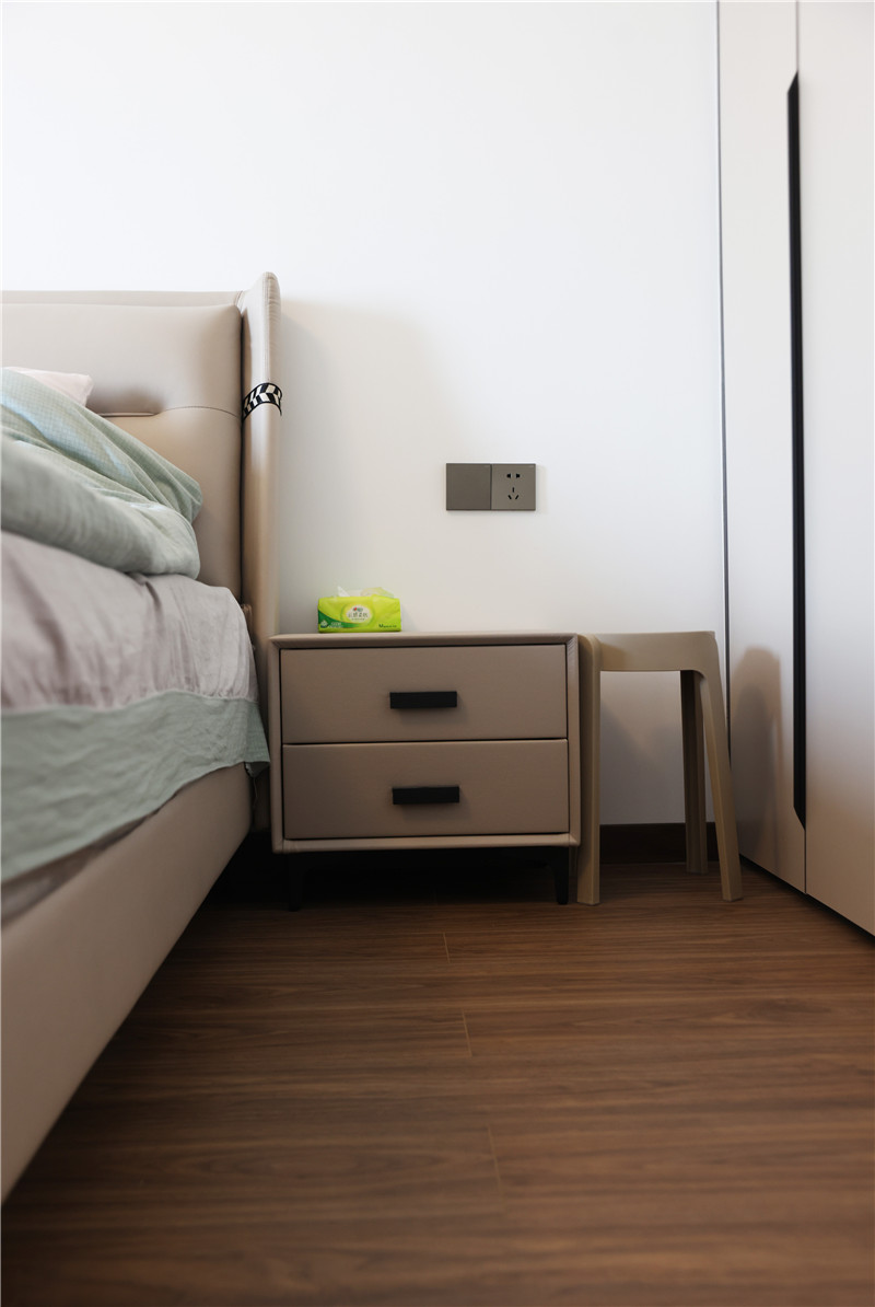 床頭柜選用深灰色與淺色的科技木紋形成對(duì)比,讓空間不單調(diào),增加觀賞性。