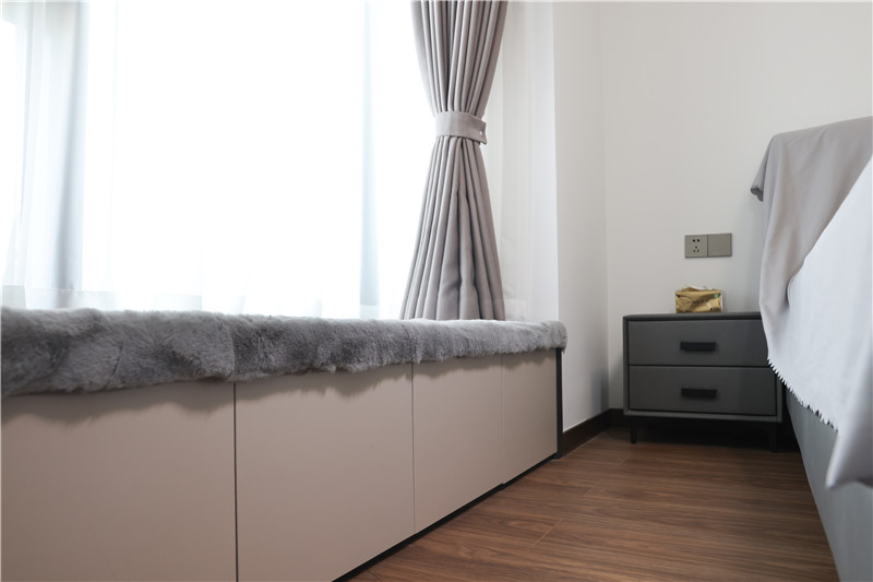 該臥室選用同種材質(zhì)做柜體,窗戶下打一組地柜增加收納功能,上方鋪上毛毯,略顯精致。