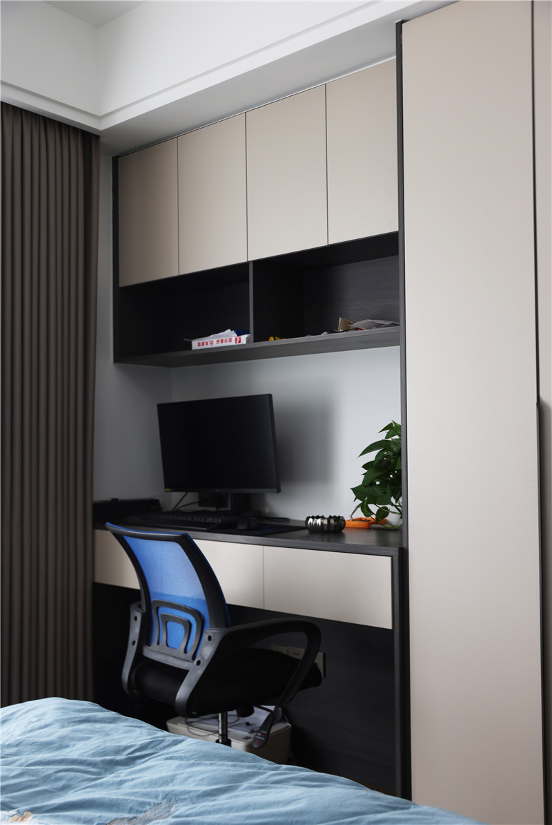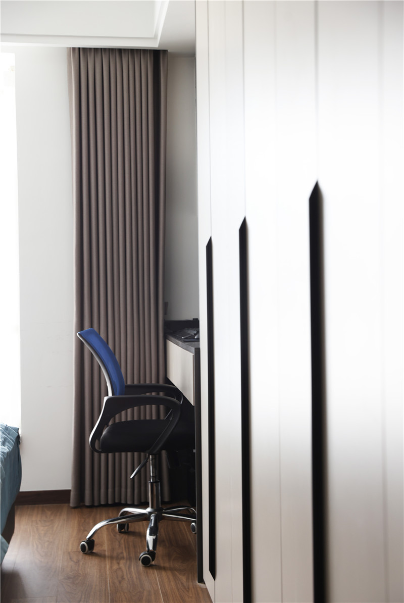 靠墻打一整面一柜到頂式衣柜,將其用作衣帽間+書桌,預(yù)留開放掛衣區(qū),滿足日常使用習(xí)慣;選用一字型長條拉手,視覺上簡潔、時(shí)尚。