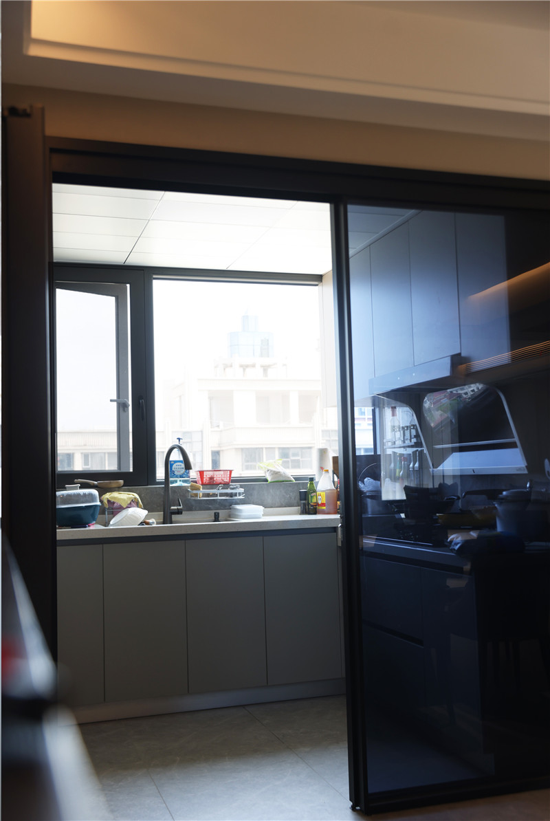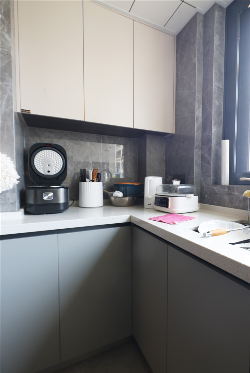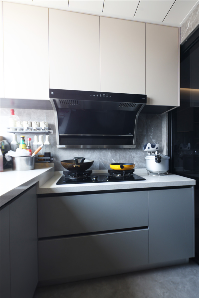 無拉手設(shè)計(jì)、高低臺(tái)面、擋水條等,該廚房設(shè)計(jì)遵從著實(shí)用、簡潔理念,打造幸福美好生活。