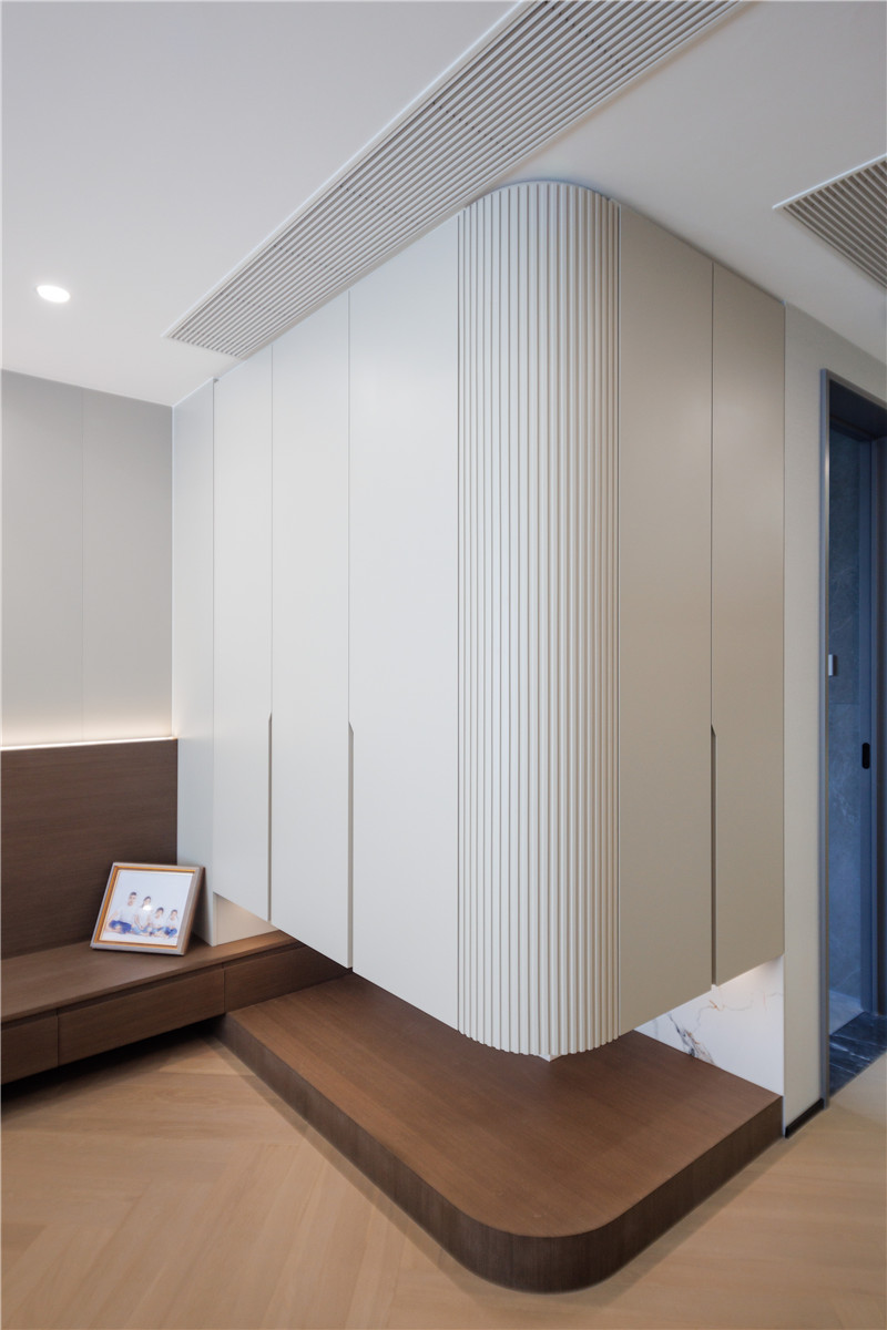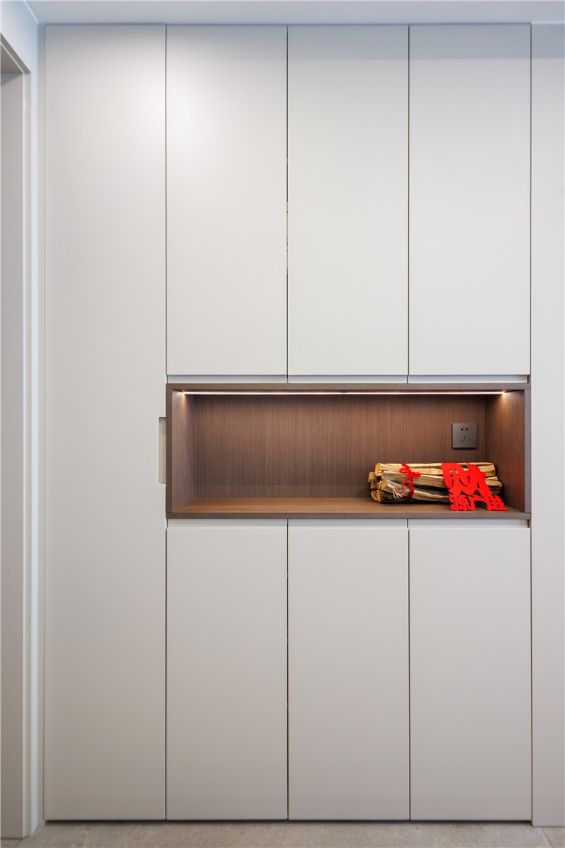 整體的設(shè)計(jì)以白色系為主,但在細(xì)節(jié)上大有異同。玄關(guān)柜采用茶白柜體,柜內(nèi)空間做斜插式的設(shè)計(jì),可以讓柜子看起來(lái)更薄,更輕盈。