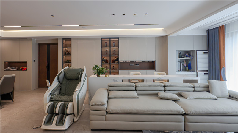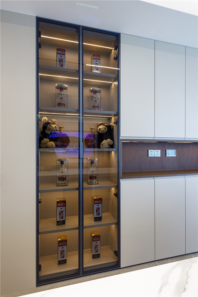 在沙發(fā)背景一側(cè),我們用一組島臺(tái)與餐桌的設(shè)計(jì)形成空間上的劃分,沿著墻壁走勢(shì)設(shè)計(jì)的酒柜與次臥門(mén)齊平,這樣整體做嵌入式的柜體收納會(huì)讓空間顯得更輕盈。半透茶色玻璃柜門(mén)也很好地展示了藏酒與工藝品,彰顯屋主的生活格調(diào)。