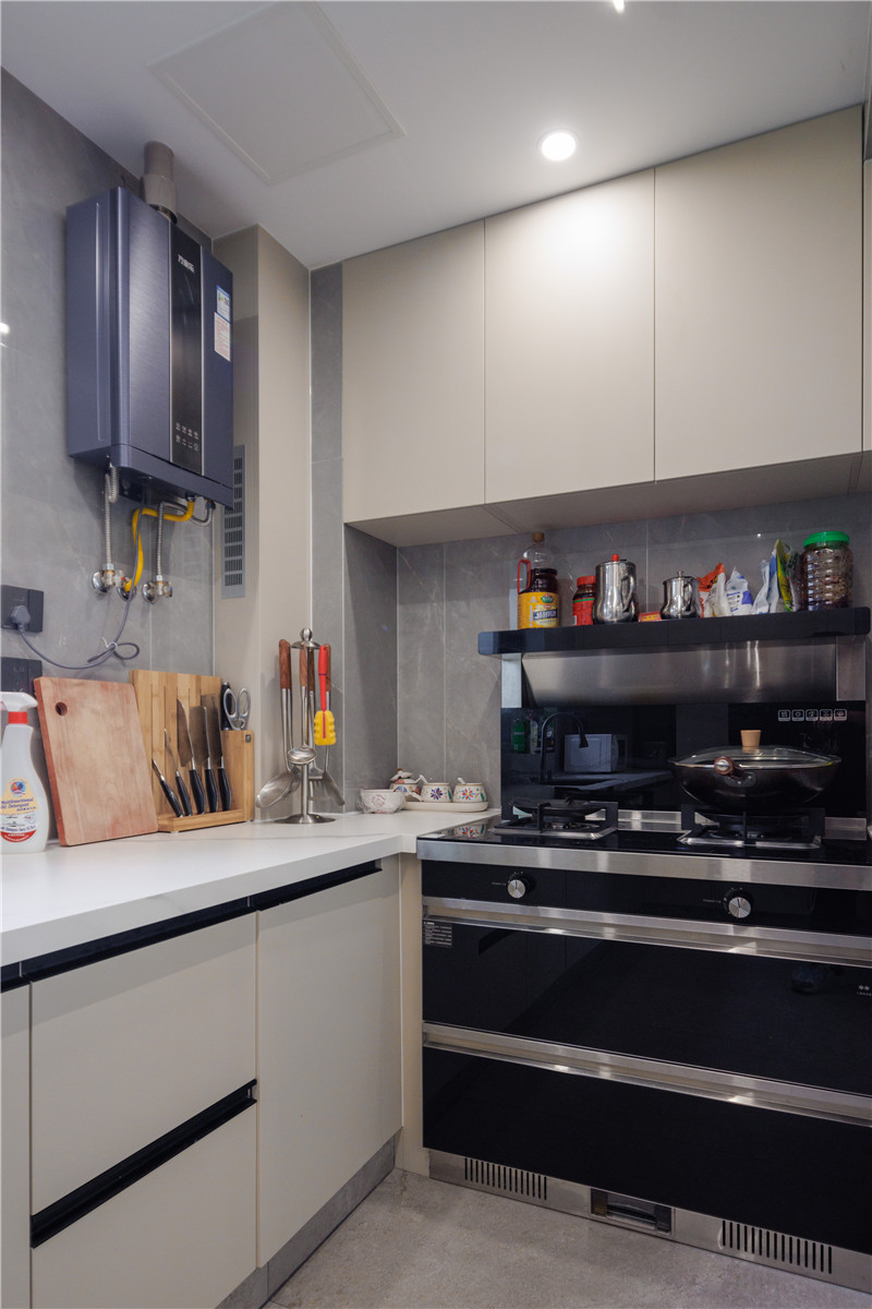 廚房里藏著一日三餐的愛(ài)意。廚房采用U型的整體布局,多層板柜體搭配水漆柜門(mén)讓櫥柜更堅(jiān)實(shí)耐用。