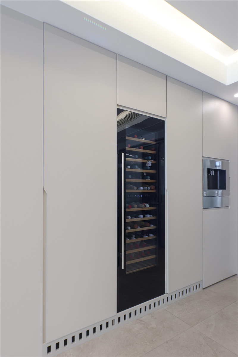 靠墻做整面餐邊柜,將冰箱嵌入其中,隱藏式設(shè)計(jì)更美觀。無(wú)把手的整面高柜給人簡(jiǎn)潔視覺(jué)體驗(yàn),不管是銑型拉手的細(xì)節(jié)還是板材的接縫處,都將工藝做到盡善盡美。