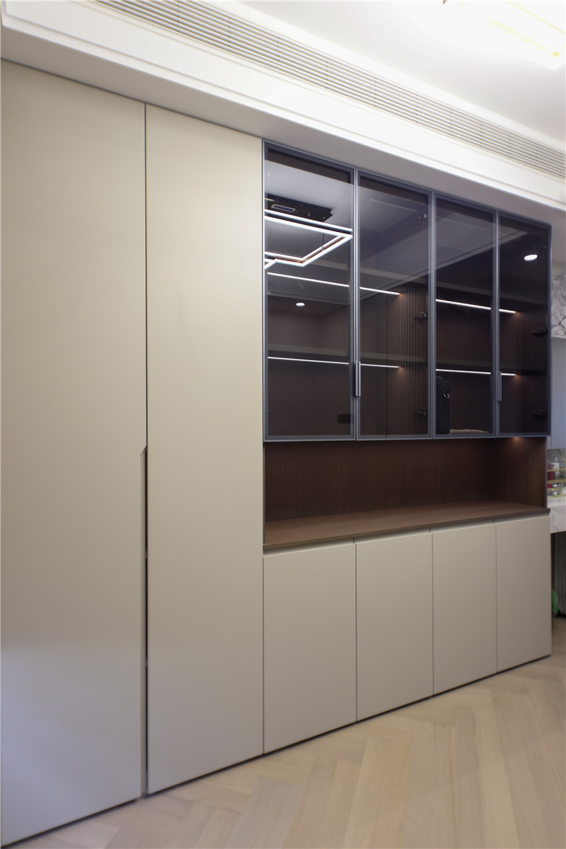 在女兒房的衣柜設(shè)計(jì)上,屋主與設(shè)計(jì)師通過(guò)半透茶色玻璃保留了一組展示柜,日后可做包包柜等進(jìn)行收納,更為精致。