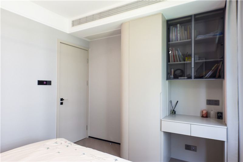 男孩房的設(shè)計(jì)上除了基礎(chǔ)的睡眠區(qū)和收納區(qū)還增設(shè)了一個(gè)學(xué)習(xí)區(qū),穿插的設(shè)計(jì)手法減少了小空間內(nèi)高柜的壓抑感,在滿足實(shí)用性的同時(shí)提升居住的舒適度。