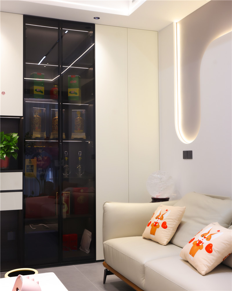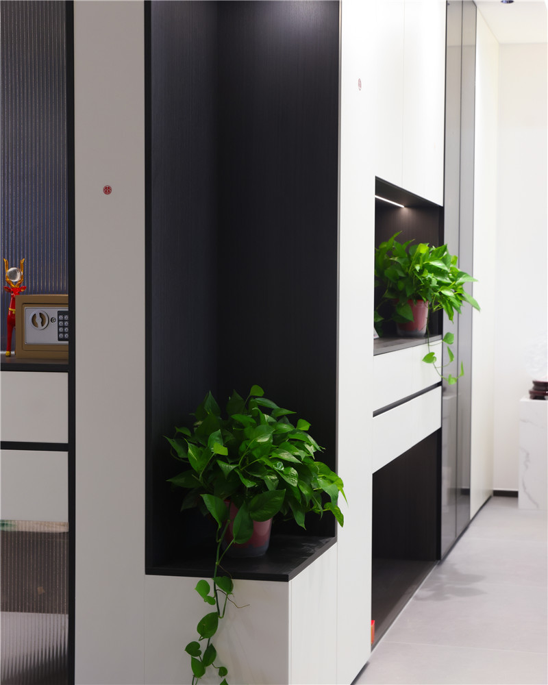 此玄關(guān)柜也充當隔斷的作用,整面白玻配合型材拐彎,若隱若現(xiàn)感讓人眼前一亮。
