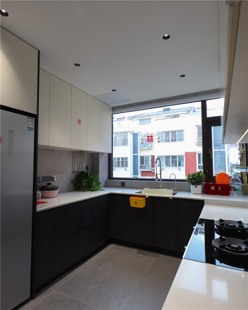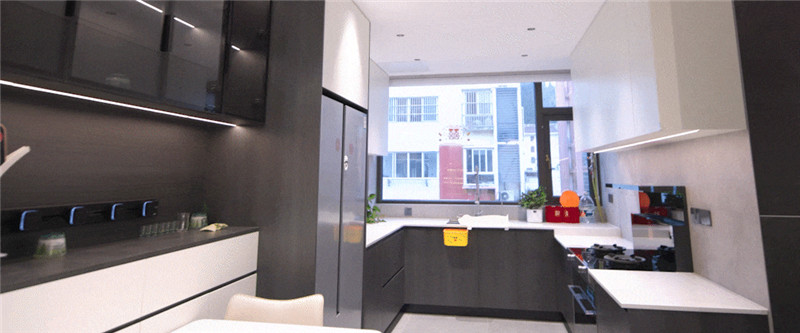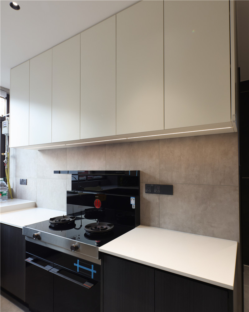 廚房U字型布局,遵循洗→切→烹→盛的動線,便捷且收納力強;櫥柜箱體及吊柜采用無拉手設(shè)計,視覺清新;整體臺面巖板運用,耐磨防滲水;冰箱與柜體組合,協(xié)調(diào)整體空間布局。