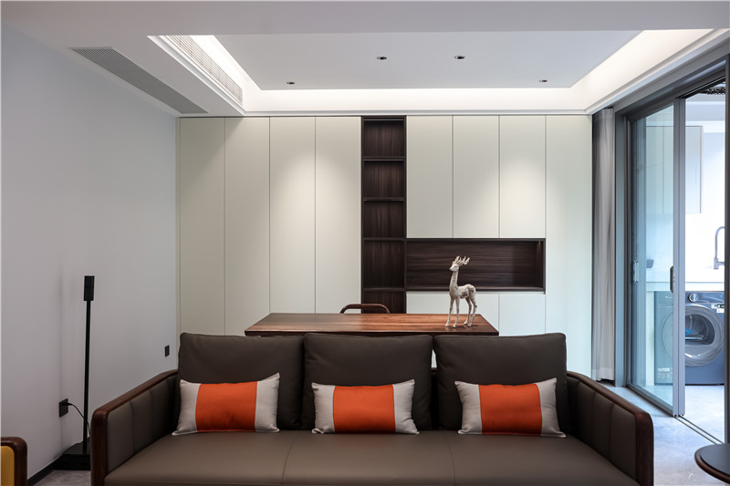 聽風(fēng)吟,賞葉落。靠近的陽臺(tái)的空間里我們將其設(shè)計(jì)為一個(gè)開放休閑區(qū),無論是想在這里辦公閱讀還是做手工、喝茶都是不錯(cuò)的選擇。榆木柜體的紋理清晰可見,搭配純凈的白色通頂柜,帶來一絲禪意,令人松弛神往。