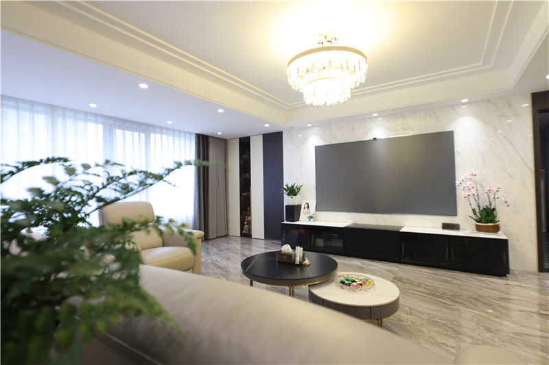 電視背景墻采用整面大理石紋背板,配以射燈點(diǎn)綴,光與紋理的融合,古典美感躍于空間;一字型地柜,黑玻柜門增添神秘感,巖板臺面耐污防潮,可以作為客廳的DIY區(qū)。