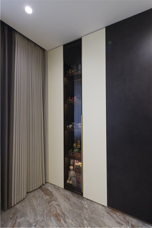 客廳陽臺打通,戶型顯大、空間通透;電視柜延伸至陽臺做到頂立柜,跳色拼接增強(qiáng)空間層次感;柜體兩側(cè)為收納區(qū)、中部為潮玩區(qū),收納與美感雙在線。