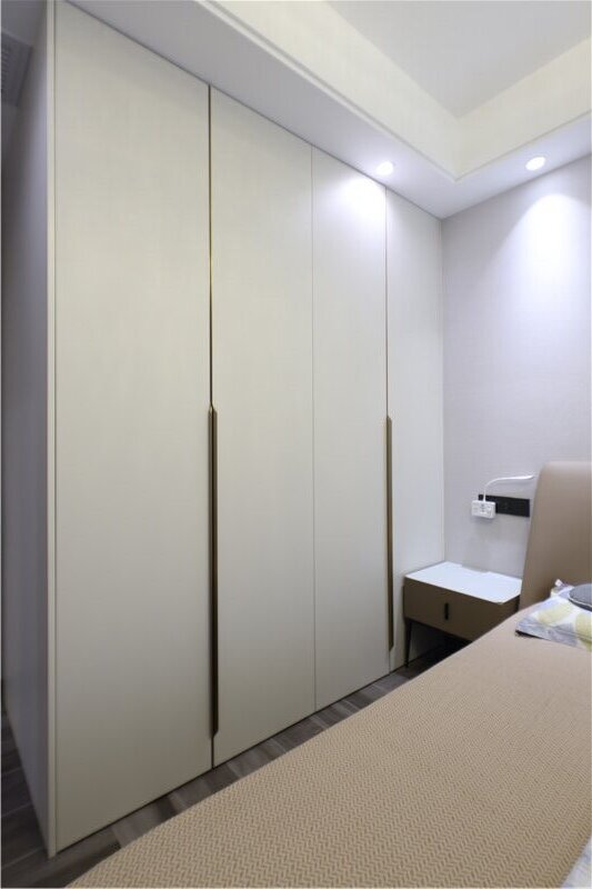 臥室安裝整面到頂衣柜,芬蘭白色調(diào)柔和,加入金屬色長拉手,簡約且時尚;小床頭柜頂部預(yù)留插座,實(shí)用性強(qiáng);主燈與輔燈結(jié)合式設(shè)計,讓小臥室也有氛圍感。