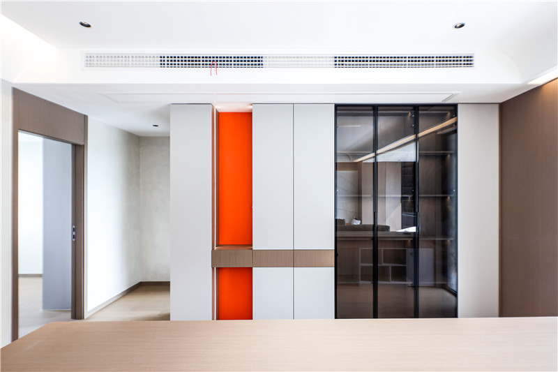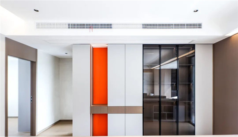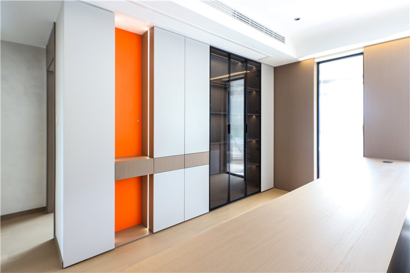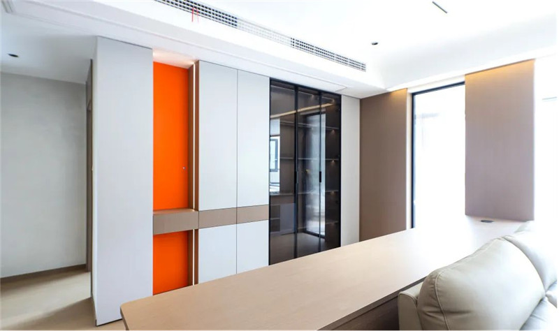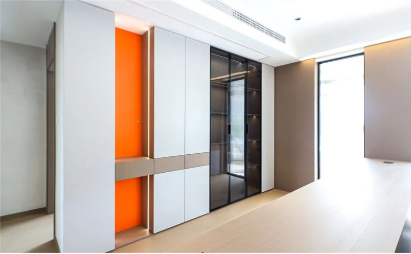 收納柜設(shè)計(jì)簡(jiǎn)約時(shí)尚,一柜到頂設(shè)計(jì)增加收納能力,玻璃柜與蘭迪米灰拼接,盡顯輕奢氛圍。