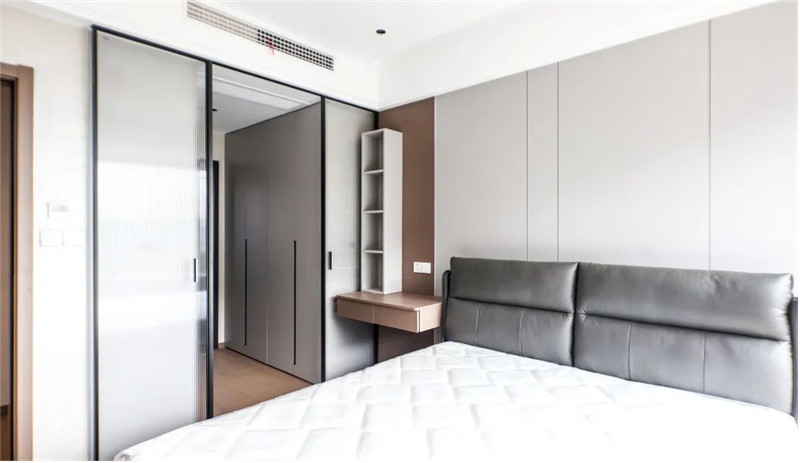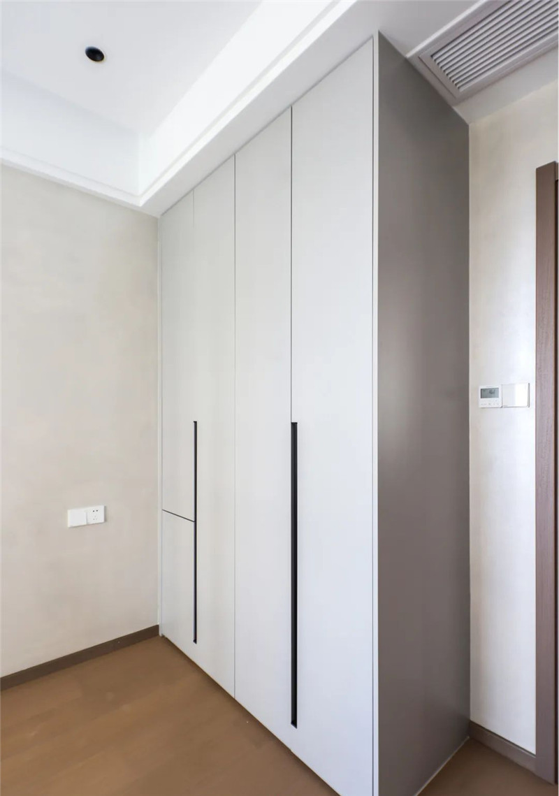衣柜配色選用的蘭迪米灰與科技直紋,配色簡(jiǎn)單時(shí)尚;一柜到頂式設(shè)計(jì)更加實(shí)用美觀;一字型長(zhǎng)條拉手,符合簡(jiǎn)約風(fēng)從簡(jiǎn)基調(diào),整體視覺(jué)效果美觀大方。