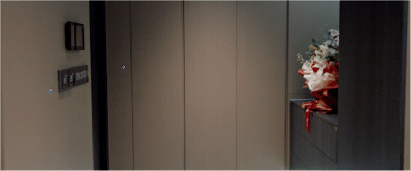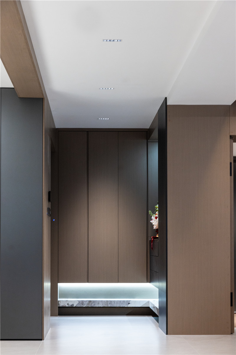 入門玄關整體L型構造,其懸浮掏空設計,顯大且具深度;玄關造型采用內退手法,借用臥室空間來做DIY放置區(qū);將條帶燈光嵌入內退區(qū)拐角,明亮通透。